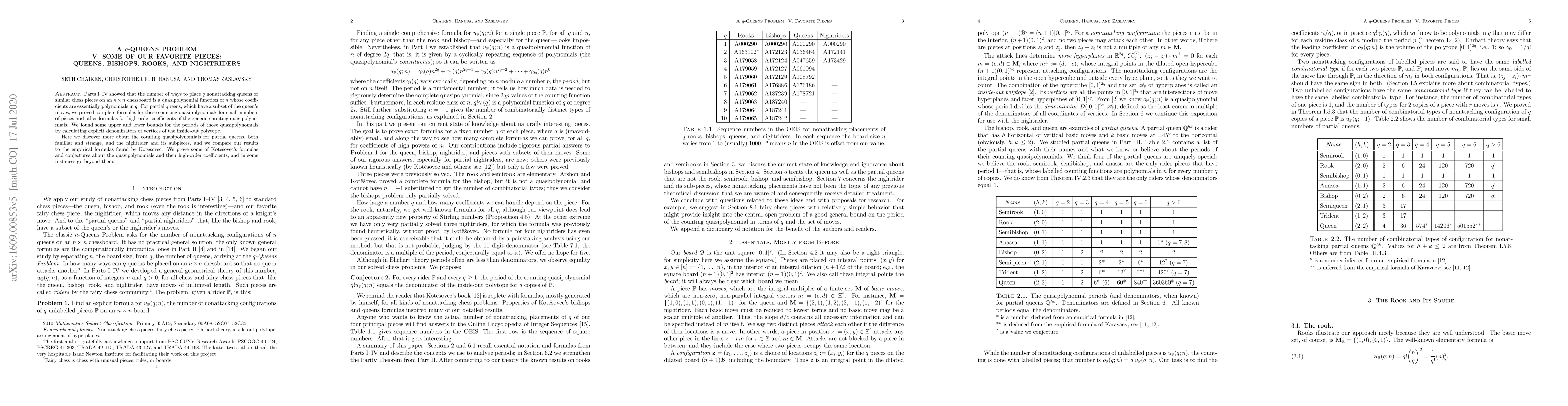 Parts I-IV showed that the number of ways to place $q$ nonattacking queens or similar chess pieces on an $n\times n$ chessboard is a quasipolynomial function of $n$ whose coefficients are essentially polynomials in $q$. For partial queens, which have a subset of the queen's moves, we proved complete formulas for these counting quasipolynomials for small numbers of pieces and other formulas for high-order coefficients of the general counting quasipolynomials. We found some upper and lower bounds for the periods of those quasipolynomials by calculating explicit denominators of vertices of the inside-out polytope. Here we discover more about the counting quasipolynomials for partial queens, both familiar and strange, and the nightrider and its subpieces, and we compare our results to the empirical formulas found by Kot\v{e}\v{s}ovec. We prove some of Kot\v{e}\v{s}ovec's formulas and conjectures about the quasipolynomials and their high-order coefficients, and in some instances go beyond them.