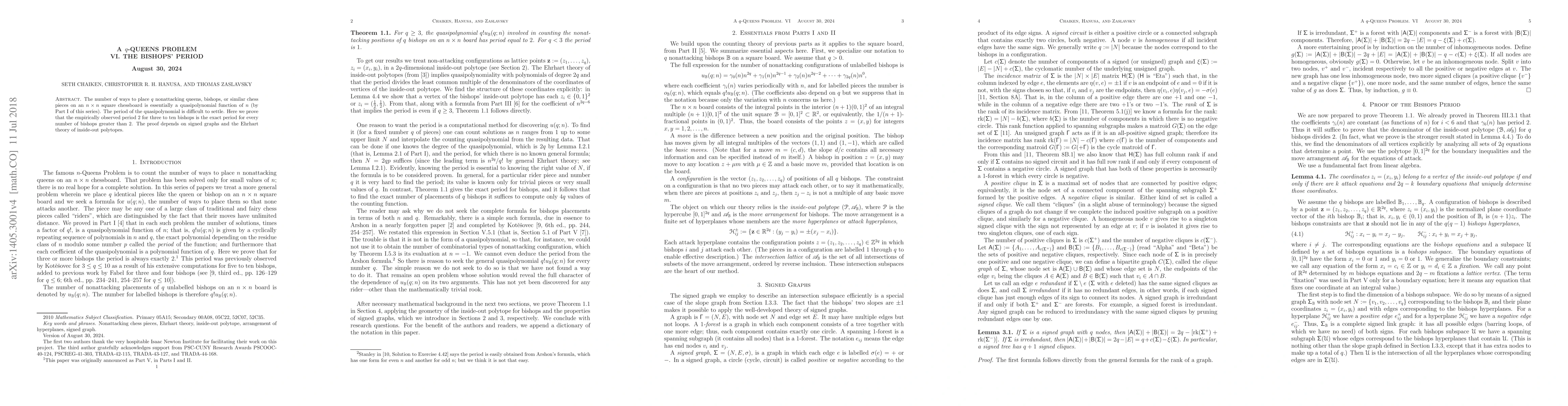 The paper proves that for more than 2 bishops on an n x n chessboard, the period of the quasipolynomial is exactly 2, using signed graphs and Ehrhart theory of inside-out polytopes. This resolves a long-standing issue in the q-Queens Problem.