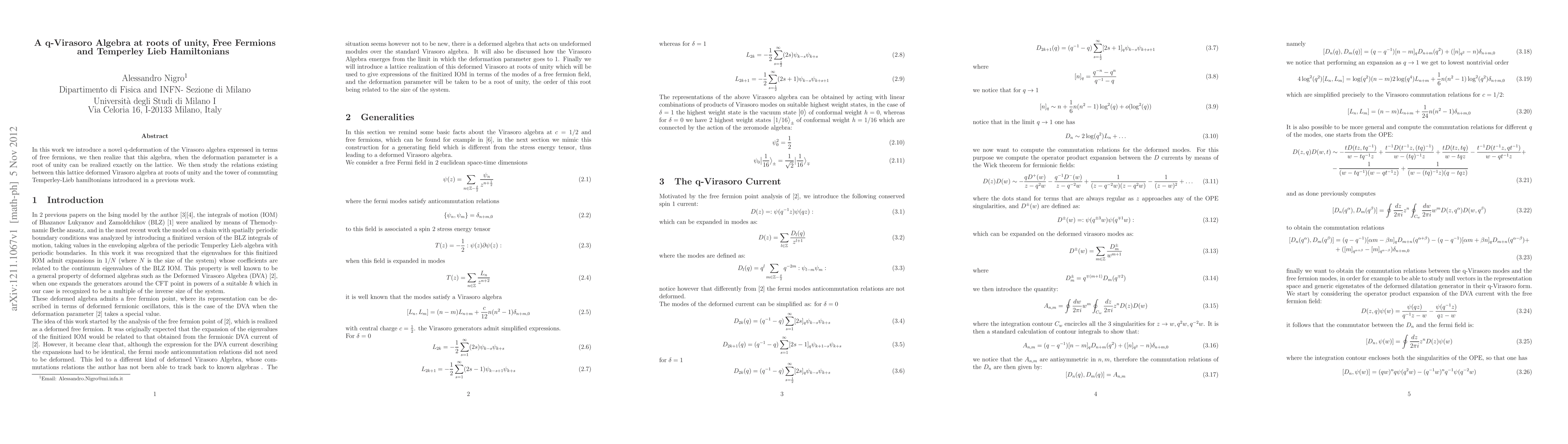 Researchers introduce a q-deformation of the Virasoro algebra using free fermions, finding it can be realized exactly on a lattice with a root of unity deformation parameter. They also explore connections to Temperley-Lieb hamiltonians.
