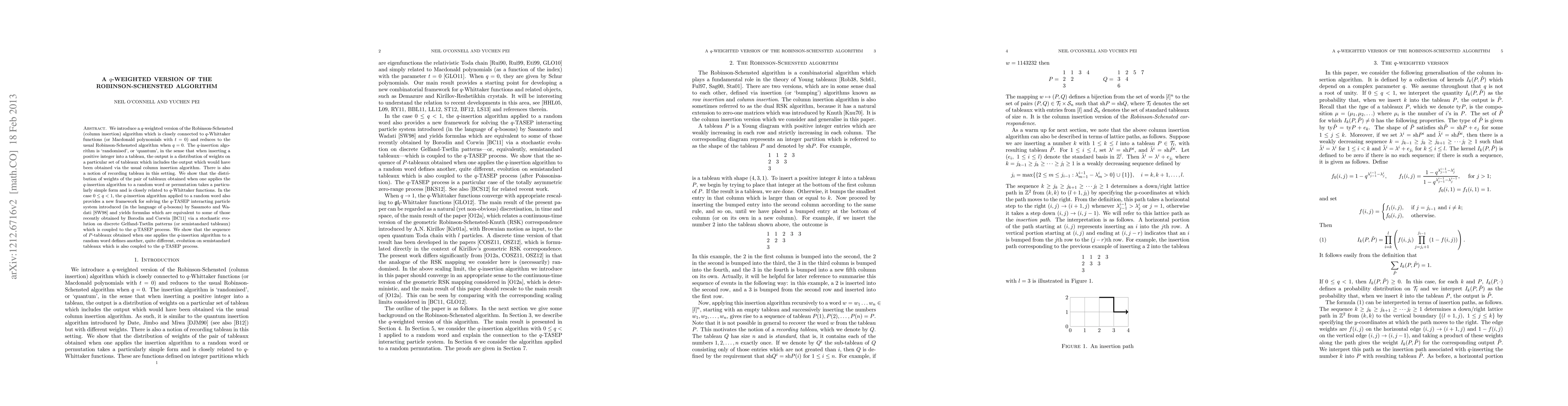 We introduce a q-weighted version of the Robinson-Schensted (column insertion) algorithm which is closely connected to q-Whittaker functions (or Macdonald polynomials with t=0) and reduces to the usual Robinson-Schensted algorithm when q=0. The q-insertion algorithm is `randomised', or `quantum', in the sense that when inserting a positive integer into a tableau, the output is a distribution of weights on a particular set of tableaux which includes the output which would have been obtained via the usual column insertion algorithm. There is also a notion of recording tableau in this setting. We show that the distribution of weights of the pair of tableaux obtained when one applies the q-insertion algorithm to a random word or permutation takes a particularly simple form and is closely related to q-Whittaker functions. In the case $0\le q<1$, the q-insertion algorithm applied to a random word also provides a new framework for solving the q-TASEP interacting particle system introduced (in the language of q-bosons) by Sasamoto and Wadati (1998) and yields formulas which are equivalent to some of those recently obtained by Borodin and Corwin (2011) via a stochastic evolution on discrete Gelfand-Tsetlin patterns (or semistandard tableaux) which is coupled to the q-TASEP process. We show that the sequence of P-tableaux obtained when one applies the q-insertion algorithm to a random word defines another, quite different, evolution on semistandard tableaux which is also coupled to the q-TASEP process.