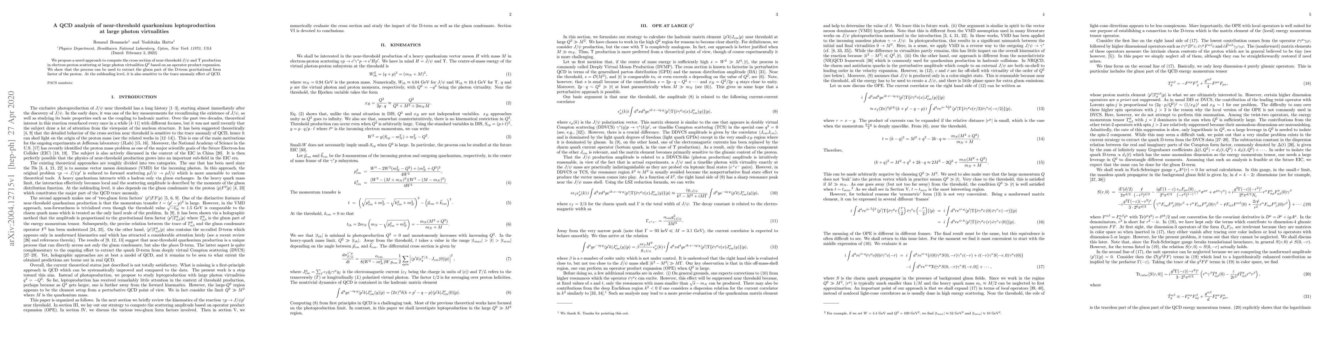 This paper presents a new QCD analysis for computing the cross section of near-threshold $J/\psi$ and $\Upsilon$ production in electron-proton scattering at high photon virtualities, utilizing an operator product expansion. The study reveals the potential to extract the gluon part of the proton's D-term gravitational form factor and sensitivity to QCD's trace anomaly effects.