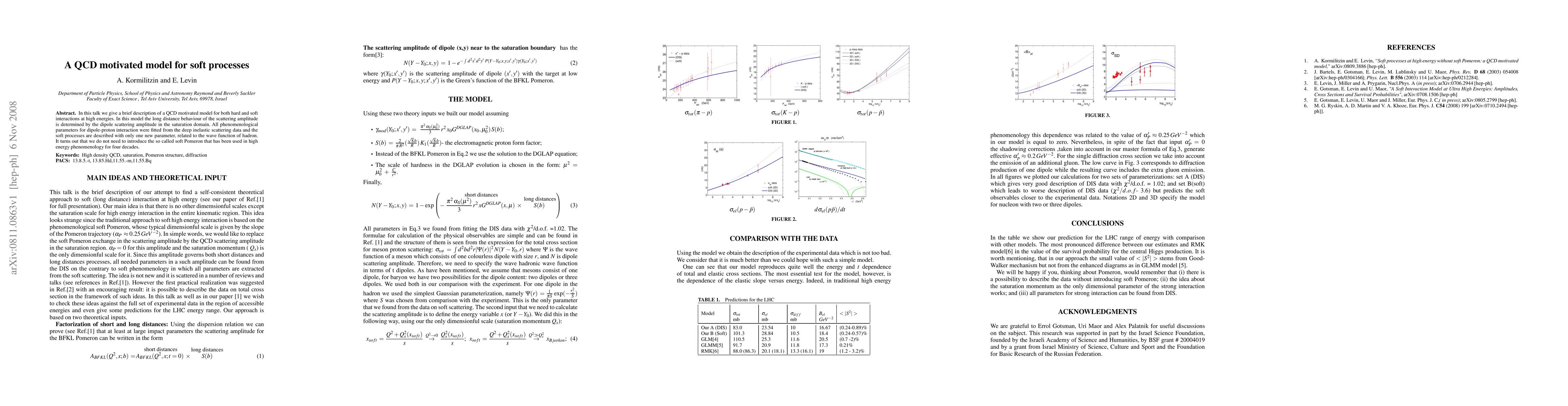 In this talk we give a brief description of a QCD motivated model for both hard and soft interactions at high energies. In this model the long distance behaviour of the scattering amplitude is determined by the dipole scattering amplitude in the saturation domain. All phenomenological parameters for dipole-proton interaction were fitted from the deep inelastic scattering data and the soft processes are described with only one new parameter, related to the wave function of hadron. It turns out that we do not need to introduce the so called soft Pomeron that has been used in high energy phenomenology for four decades.