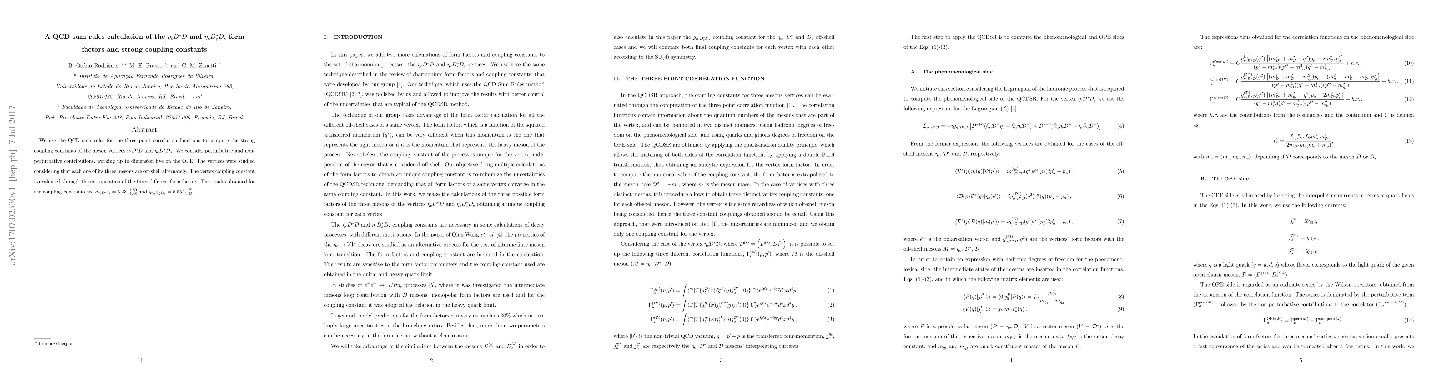 We use the QCD sum rules for the three point correlation functions to compute the strong coupling constants of the meson vertices $\eta_c D^* D$ and $\eta_c D_s^* D_s$. We consider perturbative and non-perturbative contributions, working up to dimension five on the OPE. The vertices were studied considering that each one of its three mesons are off-shell alternately. The vertex coupling constant is evaluated through the extrapolation of the three different form factors. The results obtained for the coupling constants are $g_{\eta_c D^* D} = 5.23^{+1.80}_{-1.38}$ and $g_{\eta_c D_s^* D_s}=5.55^{+1.29}_{-1.55}$.