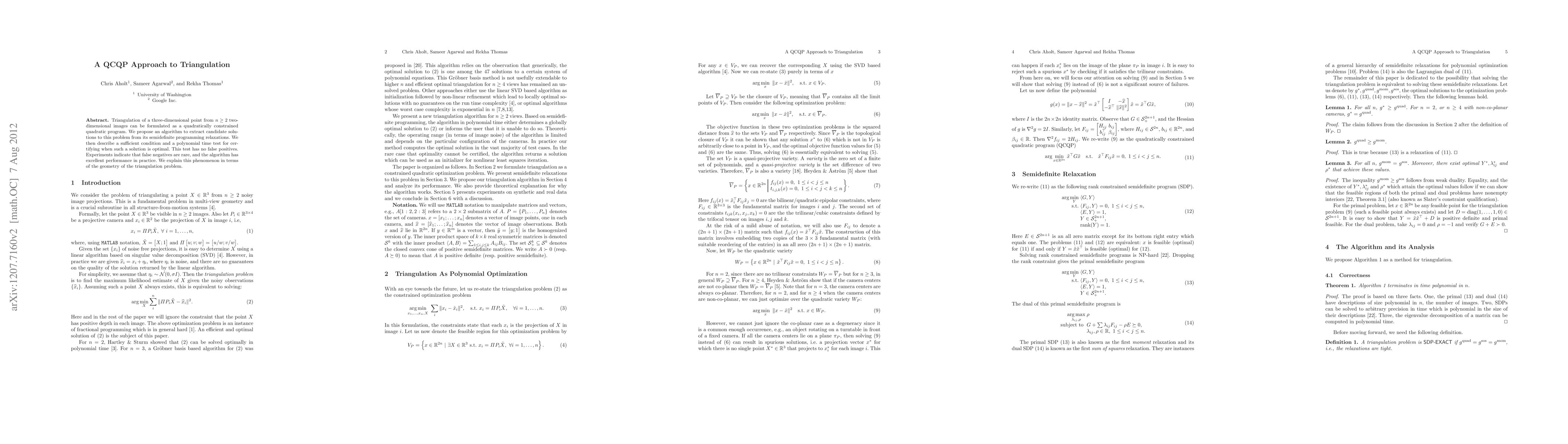 Researchers propose a method to solve triangulation problems in 3D point estimation from noisy 2D images using quadratic constraints. Their algorithm has excellent performance and rare false negatives.