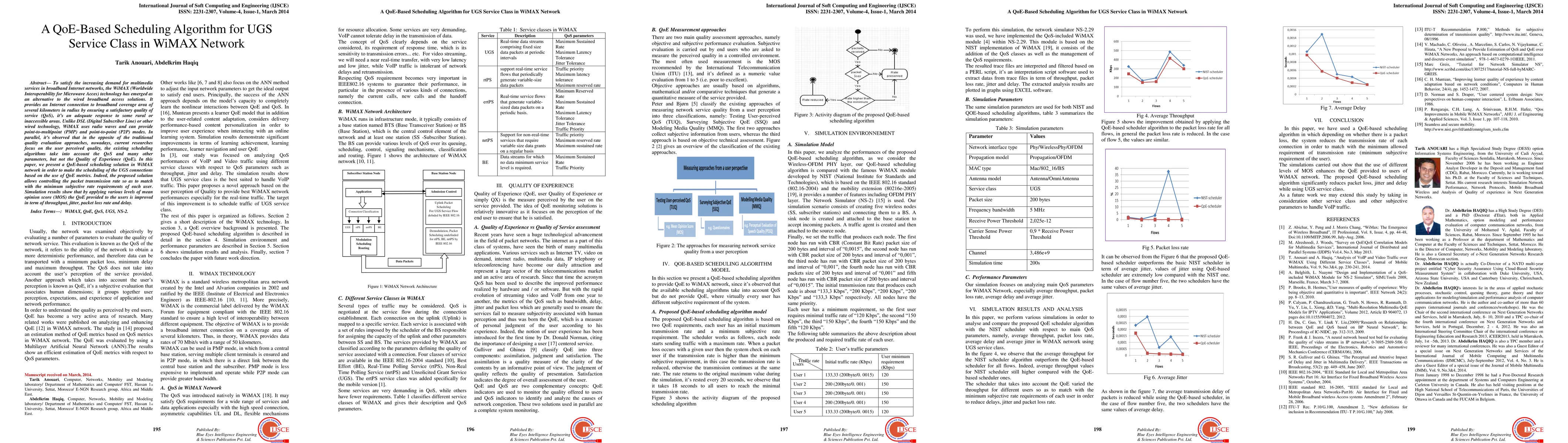 This paper proposes a QoE-based scheduling algorithm for the UGS service class in WiMAX networks, aiming to enhance user-perceived quality by controlling packet transmission rates according to minimum subjective rate requirements. Simulation results demonstrate improved QoE metrics such as throughput, jitter, packet loss rate, and delay.