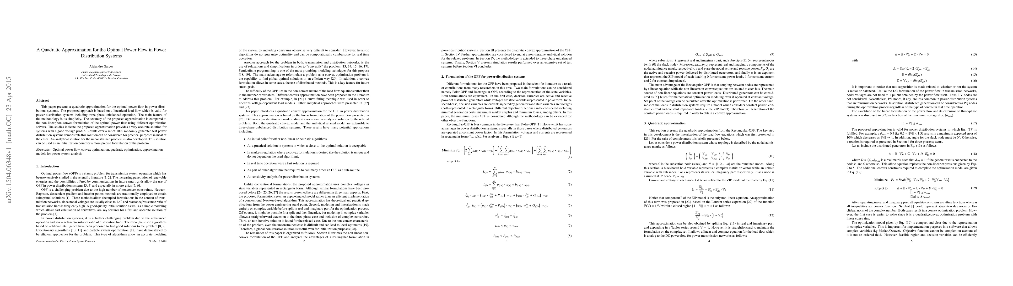 This paper proposes a simple quadratic approximation for optimal power flow in power distribution systems, validated through comparison with non-linear formulations. The method shows high accuracy for systems with good voltage profiles, as demonstrated by tests on 1000 randomly generated systems.