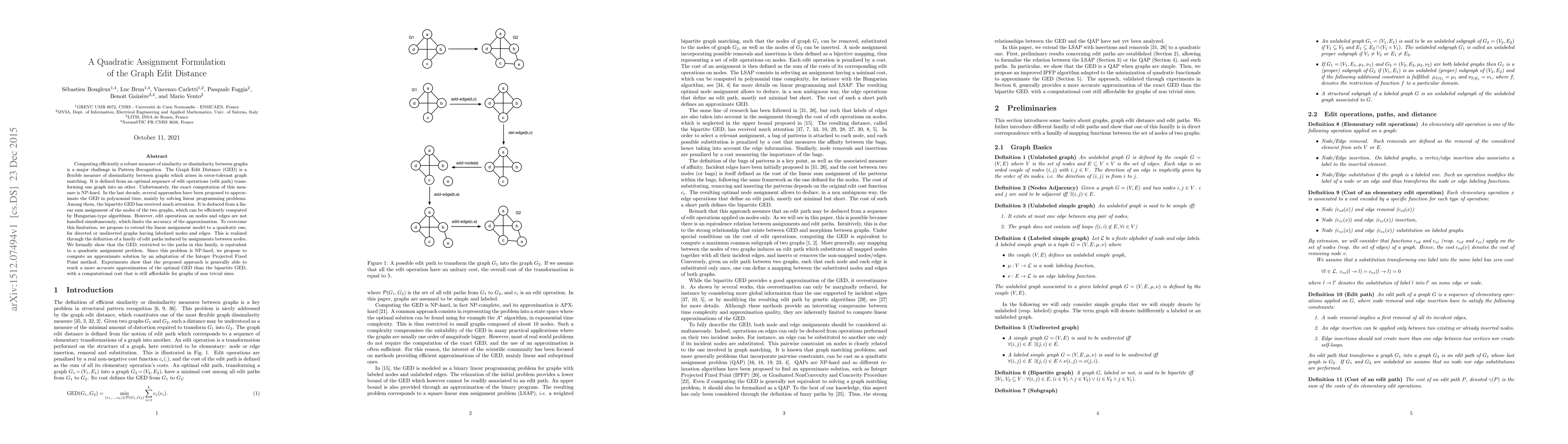 This paper proposes a quadratic assignment formulation to improve the approximation of Graph Edit Distance (GED), addressing the limitation of existing linear assignment models. The new quadratic model can handle simultaneous node and edge edit operations, leading to more accurate approximations, though it remains NP-hard; thus, an adapted Integer Projected Fixed Point method is used for efficient computation.