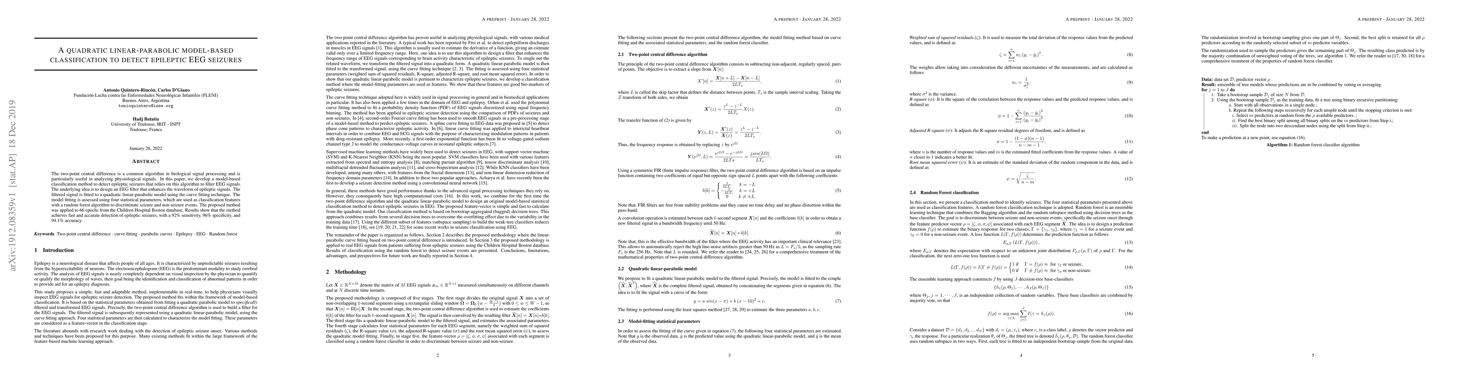 This paper proposes a model-based classification method using a quadratic linear-parabolic model to detect epileptic seizures from EEG signals. The method employs a two-point central difference filter and curve fitting to enhance seizure signals, followed by classification using a random forest algorithm, achieving 92% sensitivity, 96% specificity, and 94.1% accuracy.
