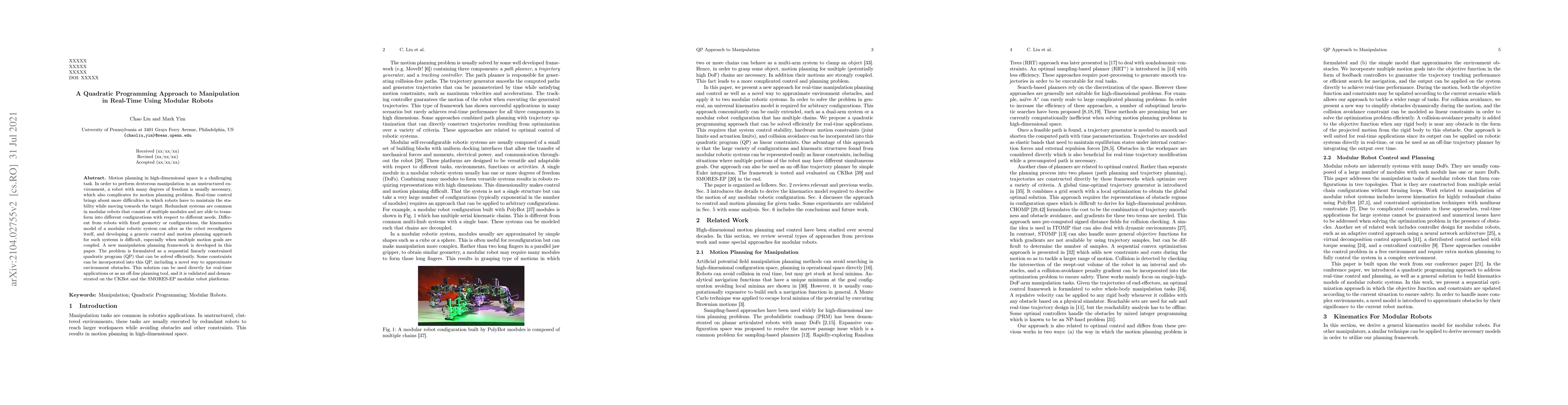 Motion planning in high-dimensional space is a challenging task. In order to perform dexterous manipulation in an unstructured environment, a robot with many degrees of freedom is usually necessary, which also complicates its motion planning problem. Real-time control brings about more difficulties in which robots have to maintain the stability while moving towards the target. Redundant systems are common in modular robots that consist of multiple modules and are able to transformed into different configurations with respect to different needs. Different from robots with fixed geometry or configurations, the kinematics model of a modular robotic system can alter as the robot reconfigures itself, and developing a generic control and motion planning approach for such systems is difficult, especially when multiple motion goals are coupled. A new manipulation planning framework is developed in this paper. The problem is formulated as a sequential linearly constrained quadratic program (QP) that can be solved efficiently. Some constraints can be incorporated into this QP, including a novel way to approximate environment obstacles. This solution can be used directly for real-time applications or as an off-line planning tool, and it is validated and demonstrated on the CKBot and SMORES-EP modular robot platforms.