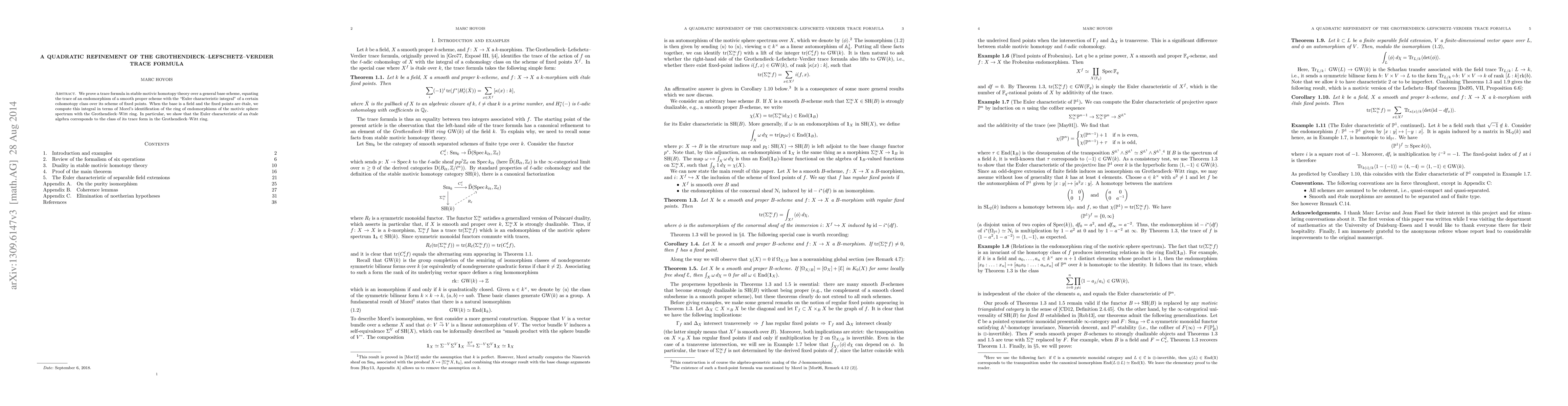 We prove a trace formula in stable motivic homotopy theory over a general base scheme, equating the trace of an endomorphism of a smooth proper scheme with the "Euler characteristic integral" of a certain cohomotopy class over its scheme of fixed points. When the base is a field and the fixed points are \'etale, we compute this integral in terms of Morel's identification of the ring of endomorphisms of the motivic sphere spectrum with the Grothendieck-Witt ring. In particular, we show that the Euler characteristic of an \'etale algebra corresponds to the class of its trace form in the Grothendieck-Witt ring.