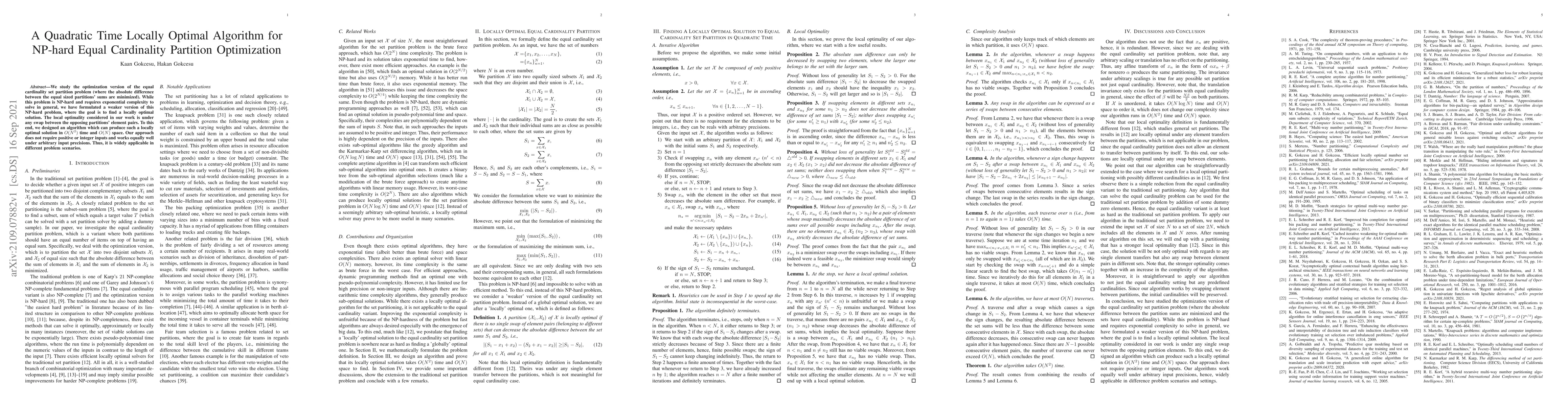 Researchers developed a new algorithm that finds a locally optimal solution to an NP-hard equal cardinality partition problem in $O(N^2)$ time and $O(N)$ space, offering a more efficient solution for certain optimization scenarios.