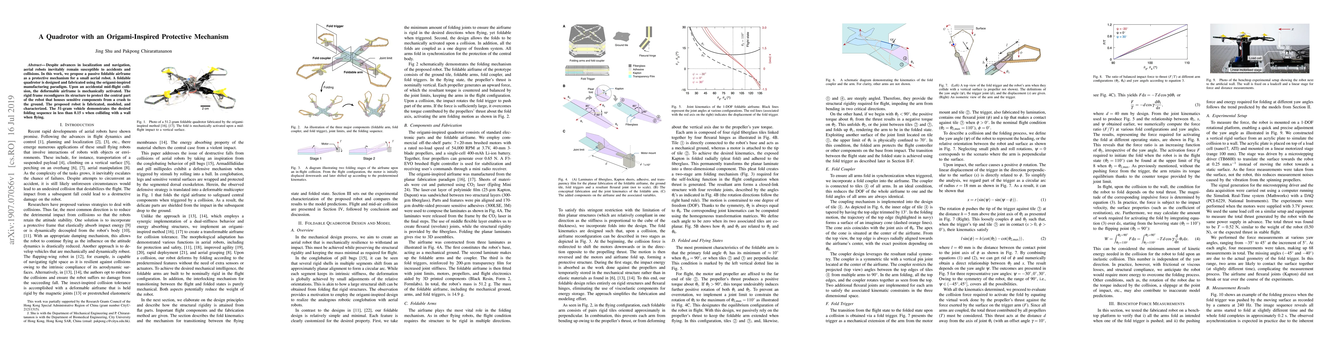 This research introduces a small quadrotor drone equipped with an origami-inspired foldable airframe that protects sensitive components upon collision. The passive mechanism rapidly reconfigures to shield the central parts, demonstrating successful folding in under 0.15 seconds after a mid-flight impact.