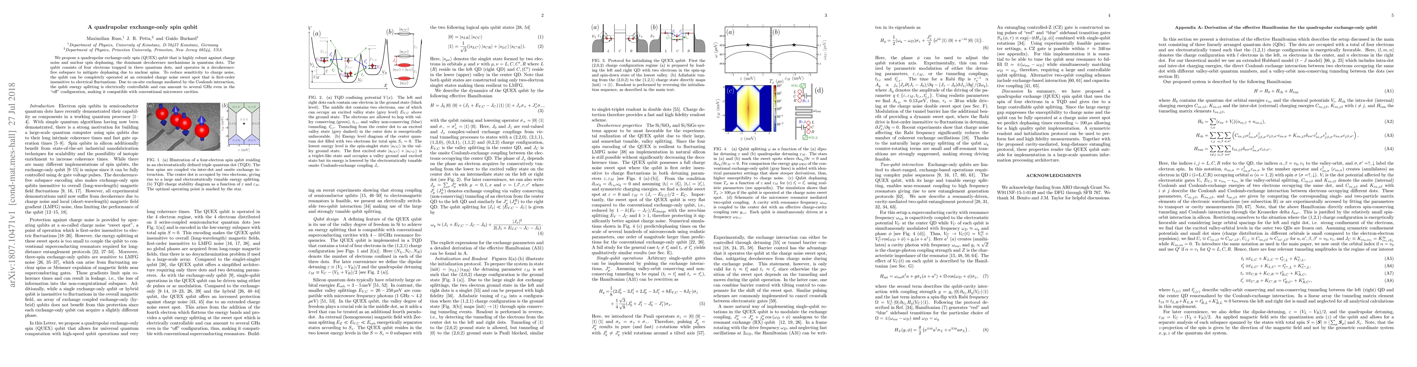This paper proposes a quadrupolar exchange-only spin (QUEX) qubit using four electrons in three quantum dots, designed to be robust against charge noise and nuclear spin dephasing. The qubit operates in a decoherence-free subspace and can be fully controlled via on-site exchange, offering high coherence and compatibility with microwave cavities.