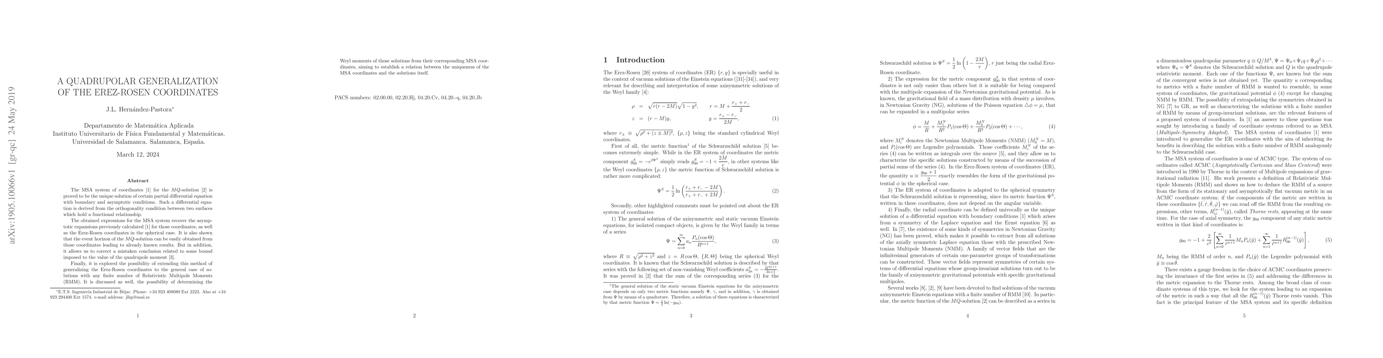This paper proves the MSA system of coordinates as the unique solution to a derived partial differential equation for the M Q-solution, correcting previous conclusions about the bound on the quadrupole moment. It also explores extending this method to solutions with multiple Relativistic Multipole Moments and determining Weyl moments from MSA coordinates.