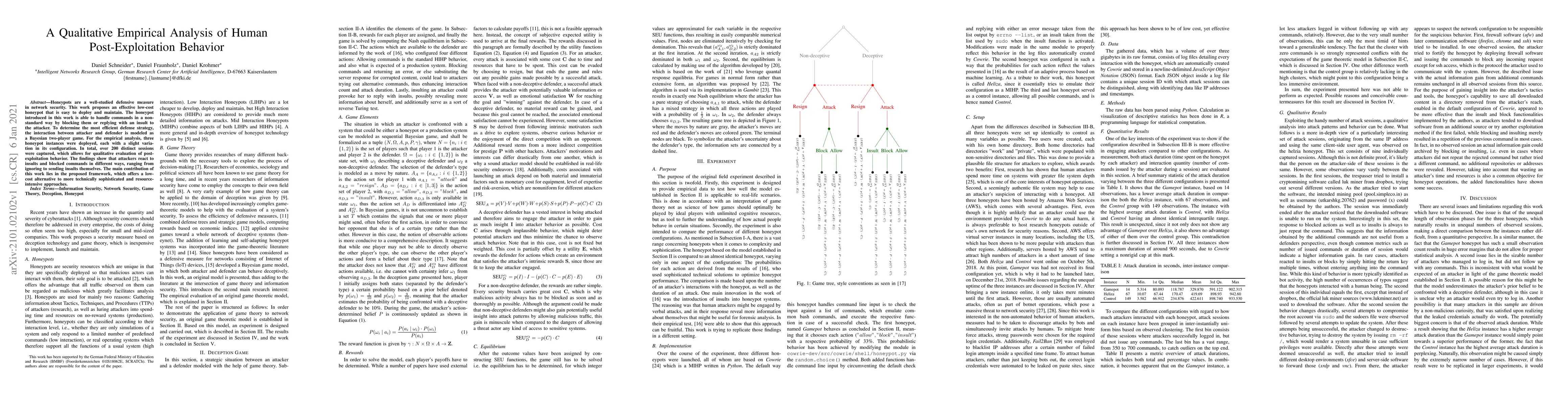 Honeypots are a well-studied defensive measure in network security. This work proposes an effective low-cost honeypot that is easy to deploy and maintain. The honeypot introduced in this work is able to handle commands in a non-standard way by blocking them or replying with an insult to the attacker. To determine the most efficient defense strategy, the interaction between attacker and defender is modeled as a Bayesian two-player game. For the empirical analysis, three honeypot instances were deployed, each with a slight variation in its configuration. In total, over 200 distinct sessions were captured, which allows for qualitative evaluation of post-exploitation behavior. The findings show that attackers react to insults and blocked commands in different ways, ranging from ignoring to sending insults themselves. The main contribution of this work lies in the proposed framework, which offers a low-cost alternative to more technically sophisticated and resource-intensive approaches.