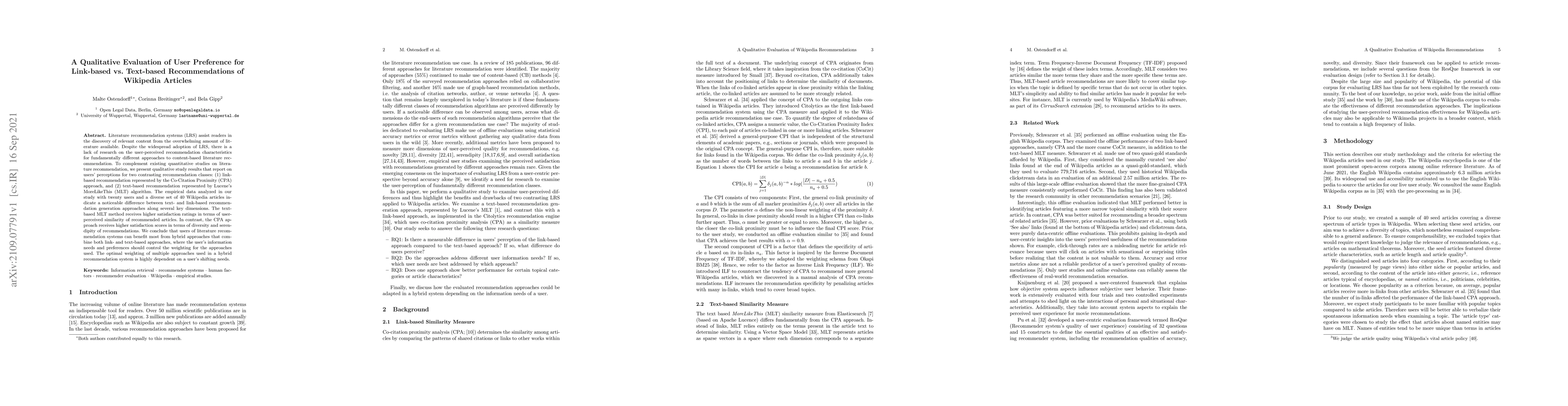 This study qualitatively examines user preferences for link-based vs. text-based recommendation systems in Wikipedia, finding higher satisfaction with text-based recommendations for perceived similarity but greater diversity and serendipity with link-based recommendations. Hybrid approaches that adapt to user needs are suggested as optimal.