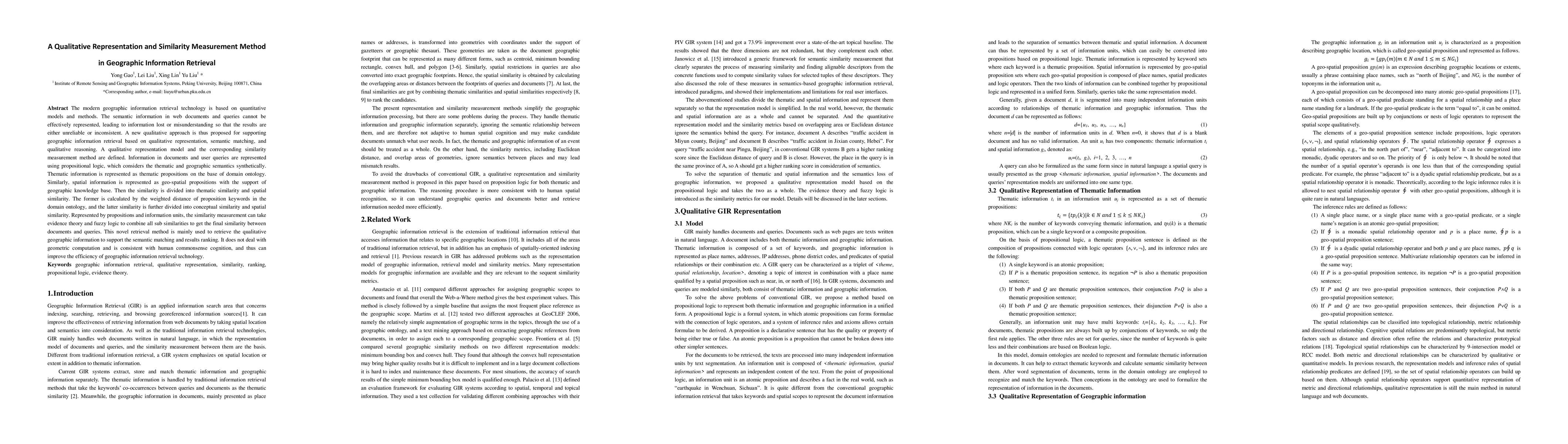 The modern geographic information retrieval technology is based on quantitative models and methods. The semantic information in web documents and queries cannot be effectively represented, leading to information lost or misunderstanding so that the results are either unreliable or inconsistent. A new qualitative approach is thus proposed for supporting geographic information retrieval based on qualitative representation, semantic matching, and qualitative reasoning. A qualitative representation model and the corresponding similarity measurement method are defined. Information in documents and user queries are represented using propositional logic, which considers the thematic and geographic semantics synthetically. Thematic information is represented as thematic propositions on the base of domain ontology. Similarly, spatial information is represented as geo-spatial propositions with the support of geographic knowledge base. Then the similarity is divided into thematic similarity and spatial similarity. The former is calculated by the weighted distance of proposition keywords in the domain ontology, and the latter similarity is further divided into conceptual similarity and spatial similarity. Represented by propositions and information units, the similarity measurement can take evidence theory and fuzzy logic to combine all sub similarities to get the final similarity between documents and queries. This novel retrieval method is mainly used to retrieve the qualitative geographic information to support the semantic matching and results ranking. It does not deal with geometric computation and is consistent with human commonsense cognition, and thus can improve the efficiency of geographic information retrieval technology.