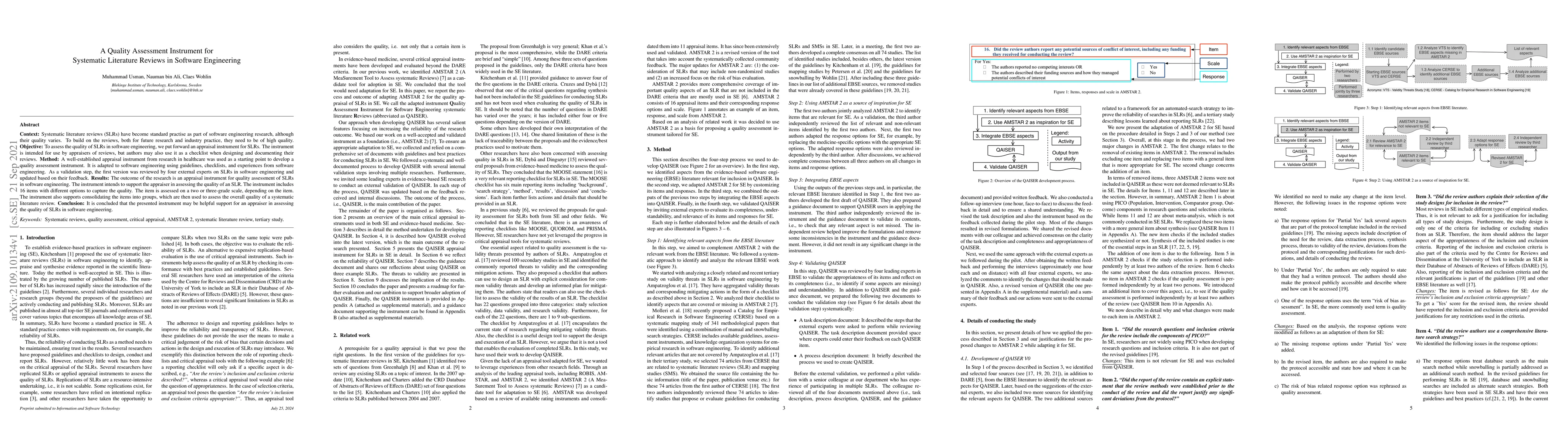 The paper proposes an appraisal instrument adapted from healthcare research to assess the quality of systematic literature reviews (SLRs) in software engineering. The instrument, comprising 16 items, aims to support both appraisers and authors in evaluating and documenting SLRs, ultimately enhancing the quality and reliability of software engineering research.