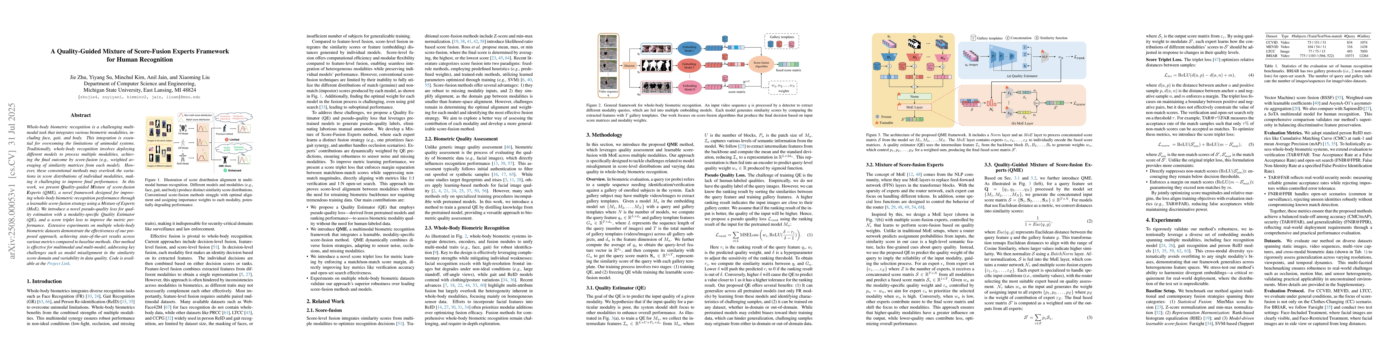 Whole-body biometric recognition is a challenging multimodal task that integrates various biometric modalities, including face, gait, and body. This integration is essential for overcoming the limitations of unimodal systems. Traditionally, whole-body recognition involves deploying different models to process multiple modalities, achieving the final outcome by score-fusion (e.g., weighted averaging of similarity matrices from each model). However, these conventional methods may overlook the variations in score distributions of individual modalities, making it challenging to improve final performance. In this work, we present \textbf{Q}uality-guided \textbf{M}ixture of score-fusion \textbf{E}xperts (QME), a novel framework designed for improving whole-body biometric recognition performance through a learnable score-fusion strategy using a Mixture of Experts (MoE). We introduce a novel pseudo-quality loss for quality estimation with a modality-specific Quality Estimator (QE), and a score triplet loss to improve the metric performance. Extensive experiments on multiple whole-body biometric datasets demonstrate the effectiveness of our proposed approach, achieving state-of-the-art results across various metrics compared to baseline methods. Our method is effective for multimodal and multi-model, addressing key challenges such as model misalignment in the similarity score domain and variability in data quality.