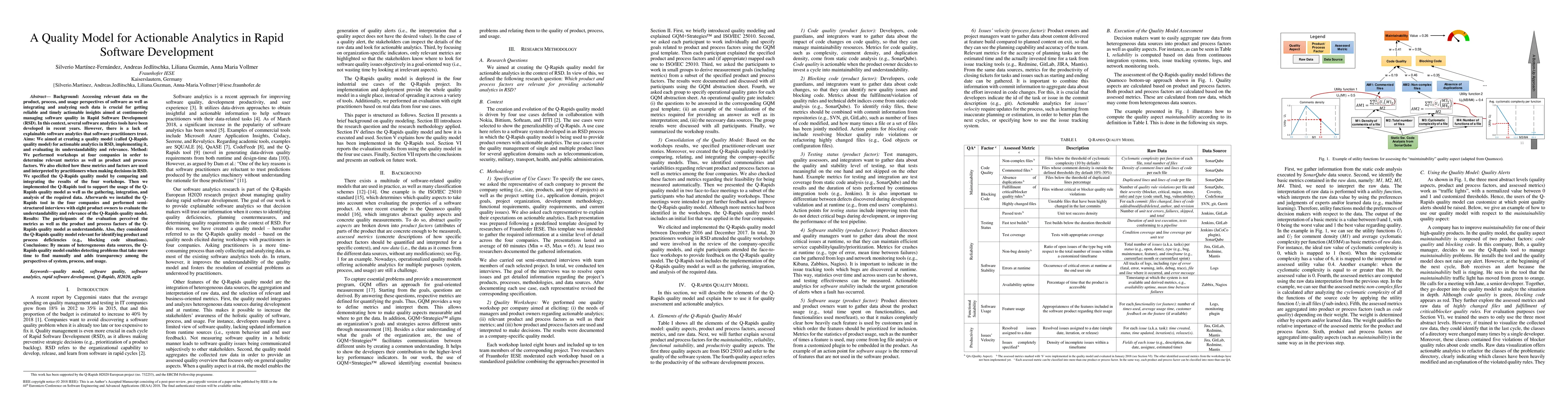 This paper presents the Q-Rapids quality model for actionable analytics in Rapid Software Development (RSD), developed through workshops to identify relevant metrics and factors. The model's understandability and relevance were evaluated in four companies, where participants found it useful for identifying deficiencies and enhancing transparency.