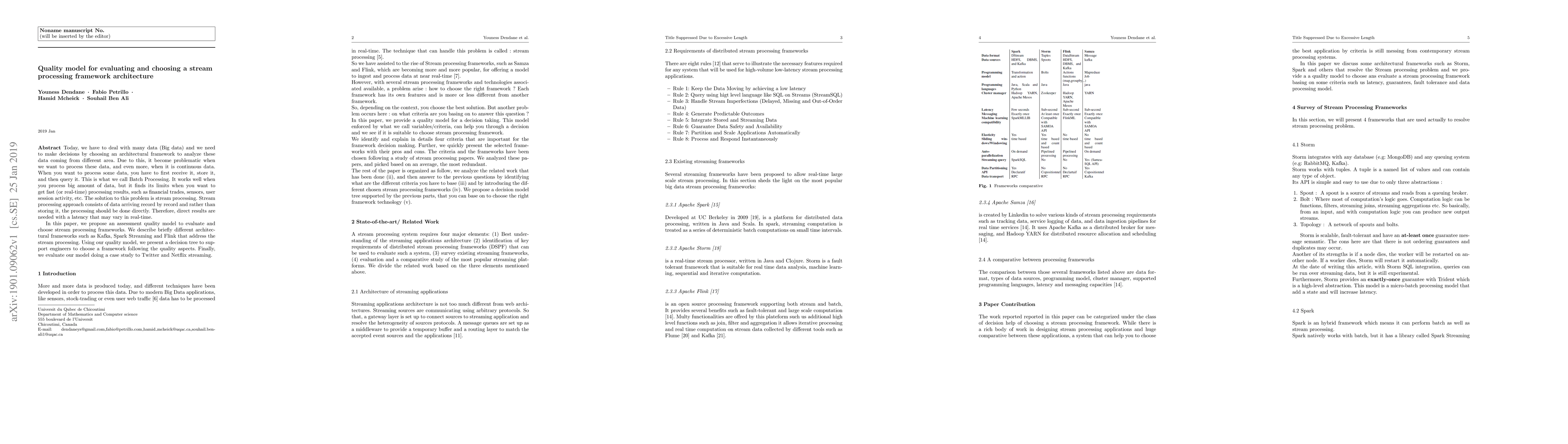 This paper proposes a quality model to evaluate and select stream processing frameworks, addressing the challenges of real-time data processing. It outlines a framework decision tree based on quality aspects, and validates the model through case studies on Twitter and Netflix streaming.