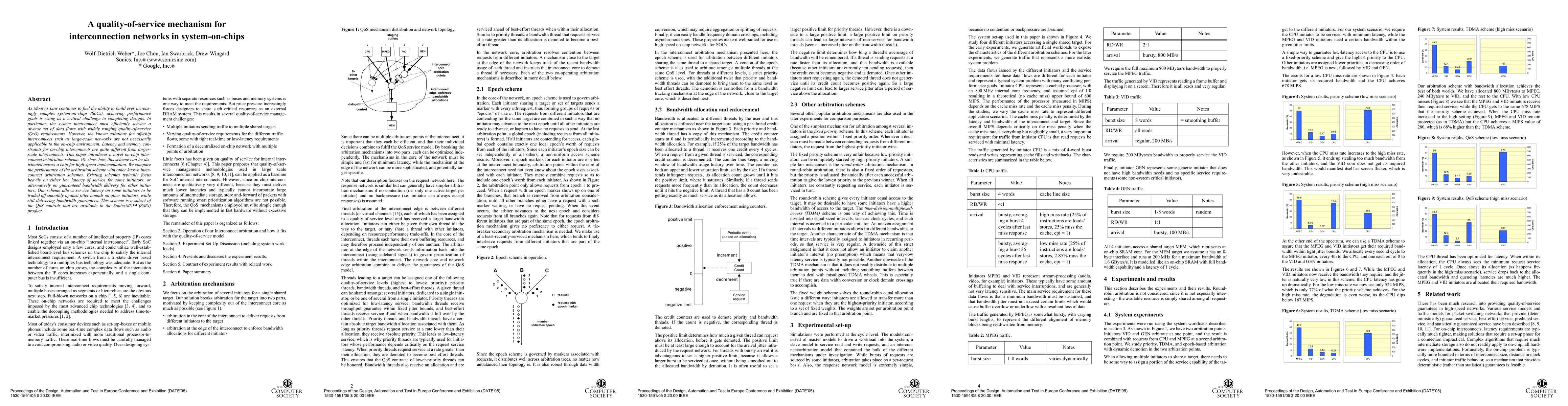 As Moore's Law continues to fuel the ability to build ever increasingly complex system-on-chips (SoCs), achieving performance goals is rising as a critical challenge to completing designs. In particular, the system interconnect must efficiently service a diverse set of data flows with widely ranging quality-of-service (QoS) requirements. However, the known solutions for off-chip interconnects such as large-scale networks are not necessarily applicable to the on-chip environment. Latency and memory constraints for on-chip interconnects are quite different from larger-scale interconnects. This paper introduces a novel on-chip interconnect arbitration scheme. We show how this scheme can be distributed across a chip for high-speed implementation. We compare the performance of the arbitration scheme with other known interconnect arbitration schemes. Existing schemes typically focus heavily on either low latency of service for some initiators, or alternatively on guaranteed bandwidth delivery for other initiators. Our scheme allows service latency on some initiators to be traded off smoothly against jitter bounds on other initiators, while still delivering bandwidth guarantees. This scheme is a subset of the QoS controls that are available in the SonicsMX? (SMX) product.