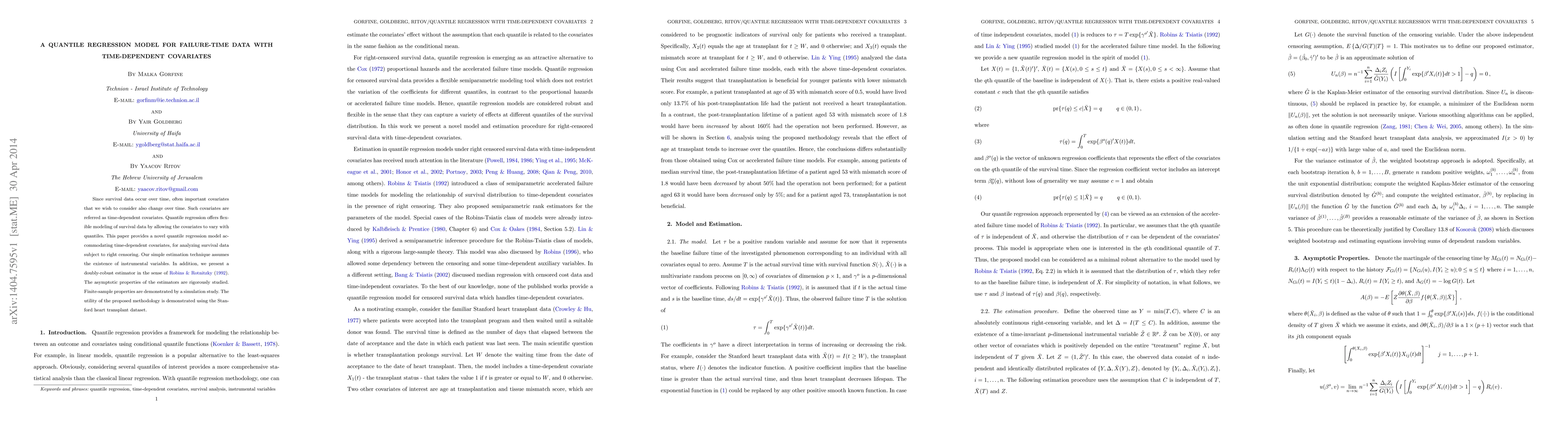 The paper proposes a novel quantile regression model for failure-time data with time-dependent covariates, utilizing an estimation technique that assumes the existence of instrumental variables and presents a doubly-robust estimator.