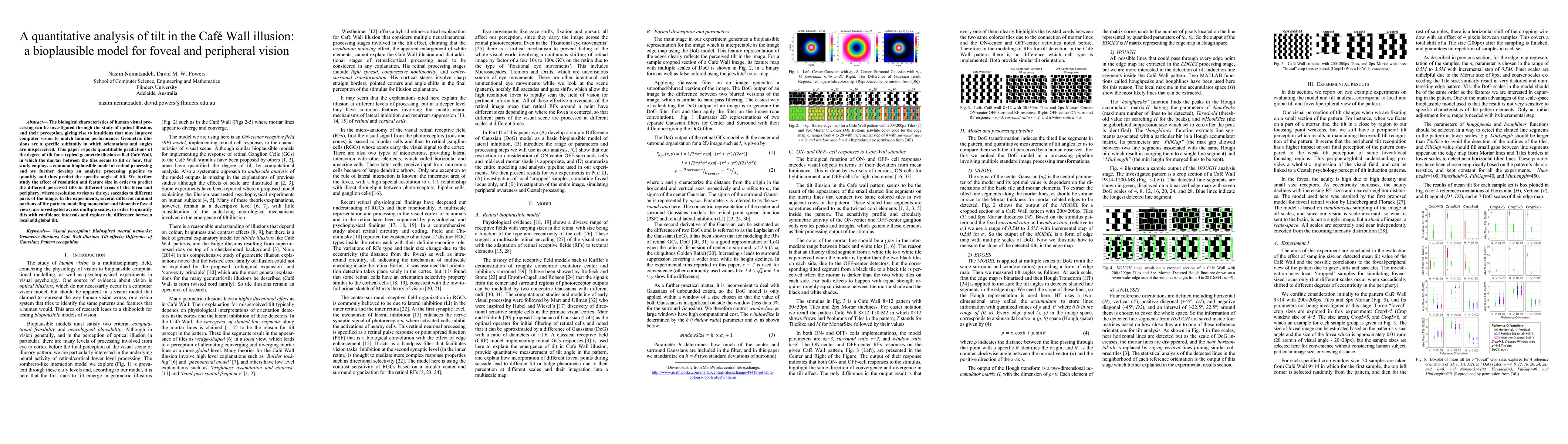 This paper quantitatively analyzes the tilt perception in the Café Wall illusion using a bioplausible model of retinal processing to predict tilt angles. It explores how varying resolution and feature size affect perceived tilt in both foveal and peripheral vision, offering insights to improve computer vision systems.