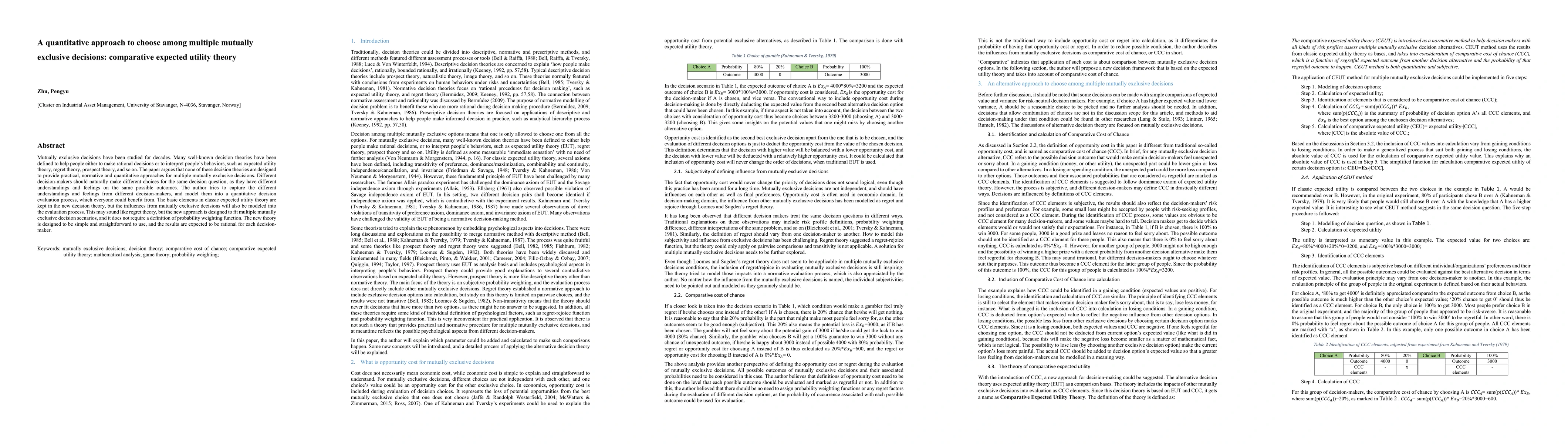 Mutually exclusive decisions have been studied for decades. Many well-known decision theories have been defined to help people either to make rational decisions or to interpret people's behaviors, such as expected utility theory, regret theory, prospect theory, and so on. The paper argues that none of these decision theories are designed to provide practical, normative and quantitative approaches for multiple mutually exclusive decisions. Different decision-makers should naturally make different choices for the same decision question, as they have different understandings and feelings on the same possible outcomes.The author tries to capture the different understandings and feelings from different decision-makers, and model them into a quantitative decision evaluation process, which everyone could benefit from. The basic elements in classic expected utility theory are kept in the new decision theory, but the influences from mutually exclusive decisions will also be modeled into the evaluation process. This may sound like regret theory, but the new approach is designed to fit multiple mutually exclusive decision scenarios, and it does not require a definition of probability weighting function. The new theory is designed to be simple and straightforward to use, and the results are expected to be rational for each decision-maker.