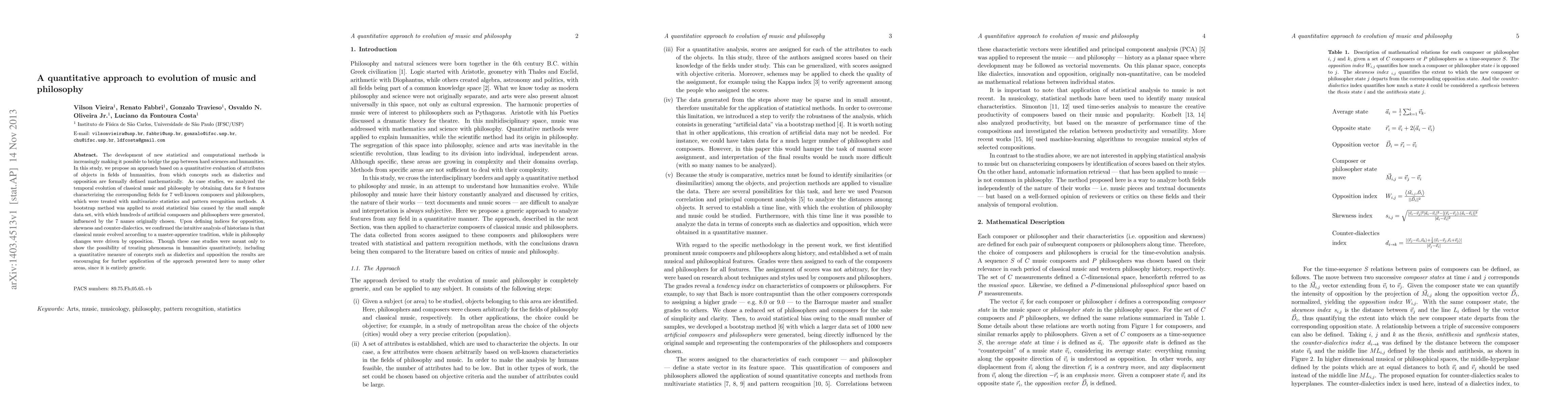 The development of new statistical and computational methods is increasingly making it possible to bridge the gap between hard sciences and humanities. In this study, we propose an approach based on a quantitative evaluation of attributes of objects in fields of humanities, from which concepts such as dialectics and opposition are formally defined mathematically. As case studies, we analyzed the temporal evolution of classical music and philosophy by obtaining data for 8 features characterizing the corresponding fields for 7 well-known composers and philosophers, which were treated with multivariate statistics and pattern recognition methods. A bootstrap method was applied to avoid statistical bias caused by the small sample data set, with which hundreds of artificial composers and philosophers were generated, influenced by the 7 names originally chosen. Upon defining indices for opposition, skewness and counter-dialectics, we confirmed the intuitive analysis of historians in that classical music evolved according to a master-apprentice tradition, while in philosophy changes were driven by opposition. Though these case studies were meant only to show the possibility of treating phenomena in humanities quantitatively, including a quantitative measure of concepts such as dialectics and opposition the results are encouraging for further application of the approach presented here to many other areas, since it is entirely generic.