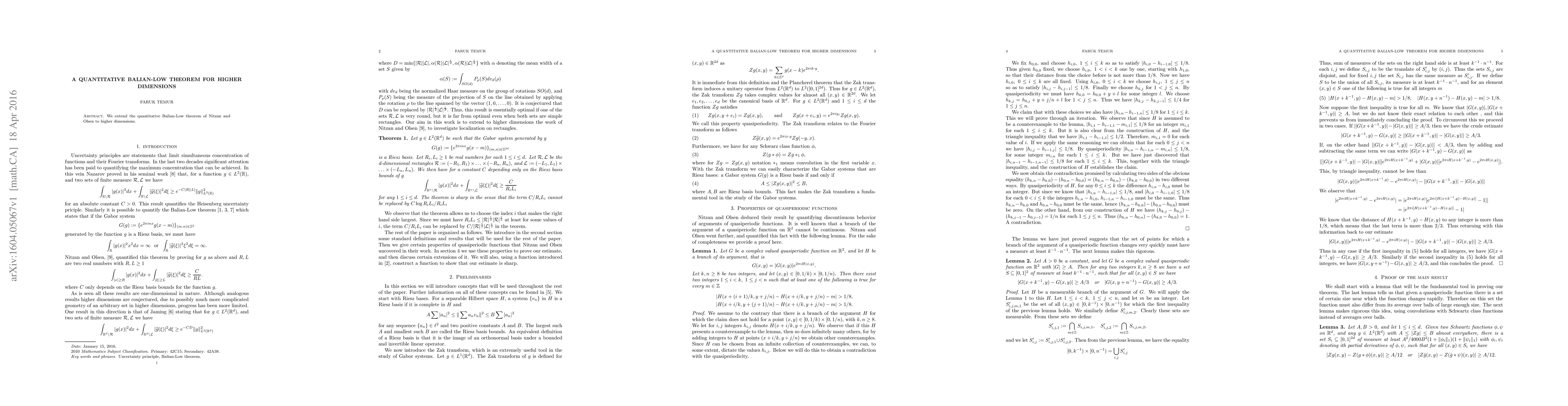 Summary: This paper extends the quantitative Balian-Low theorem, originally developed by Nitzan and Olsen, to higher-dimensional systems, providing a broader framework for understanding the relationship between energy levels and wave packet dynamics.