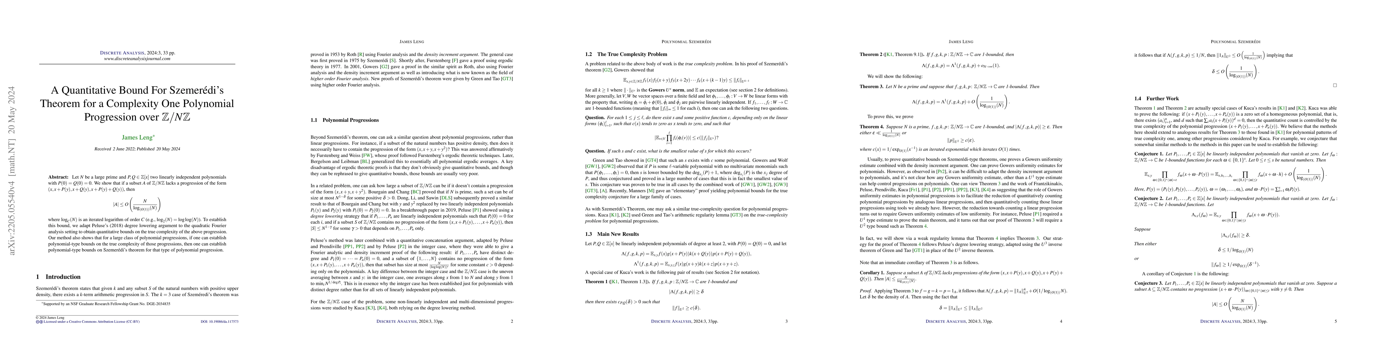 This paper establishes a quantitative bound for Szemerédi's theorem concerning polynomial progressions over $\mathbb{Z}/N\mathbb{Z}$, showing that subsets lacking certain progressions are significantly smaller. The bound is derived using adapted degree lowering techniques in quadratic Fourier analysis.