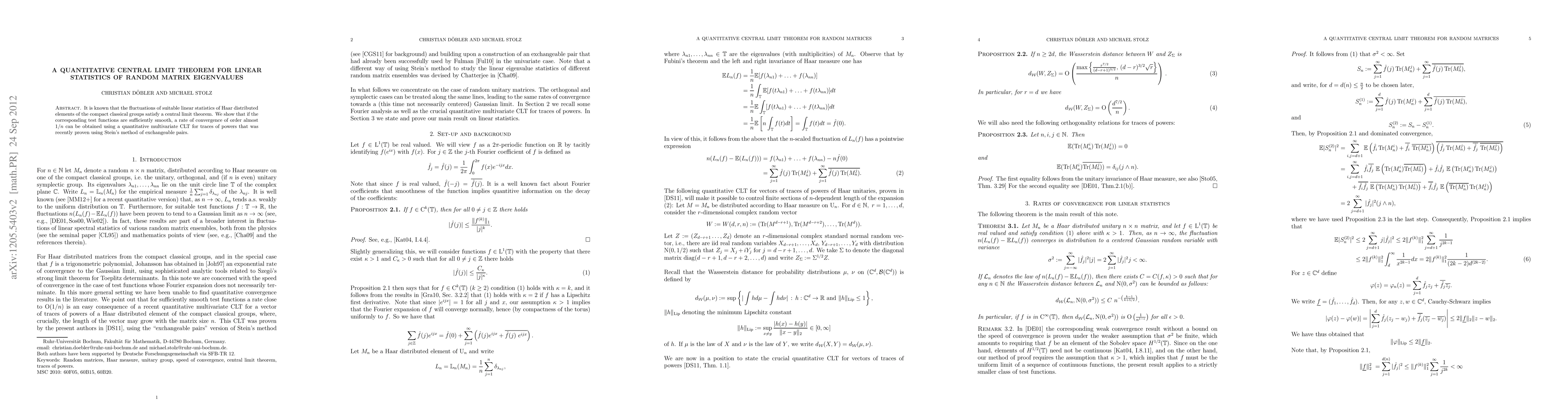 This paper demonstrates a quantitative central limit theorem for linear statistics of eigenvalues from Haar distributed random matrices, achieving a convergence rate of nearly $1/n$ using a recent multivariate CLT for matrix traces, validated through Stein's method of exchangeable pairs.