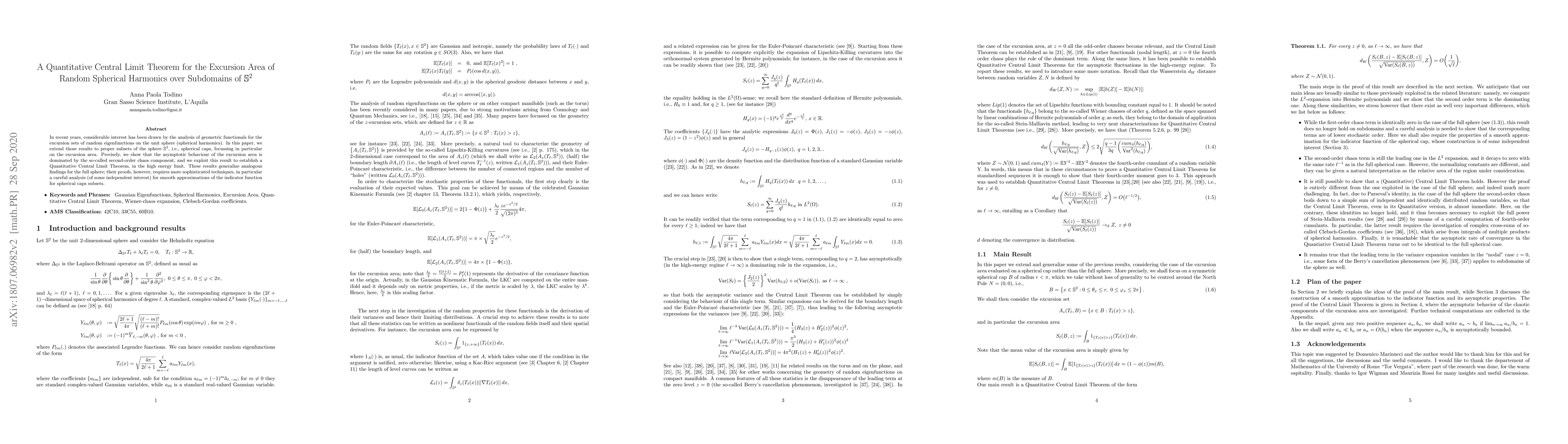 This paper extends the analysis of geometric functionals for random spherical harmonics to spherical caps, focusing on the excursion area. It establishes a Quantitative Central Limit Theorem for the excursion area, showing that its asymptotic behavior is dominated by the second-order chaos component, and requires sophisticated techniques for smooth approximations of spherical caps.