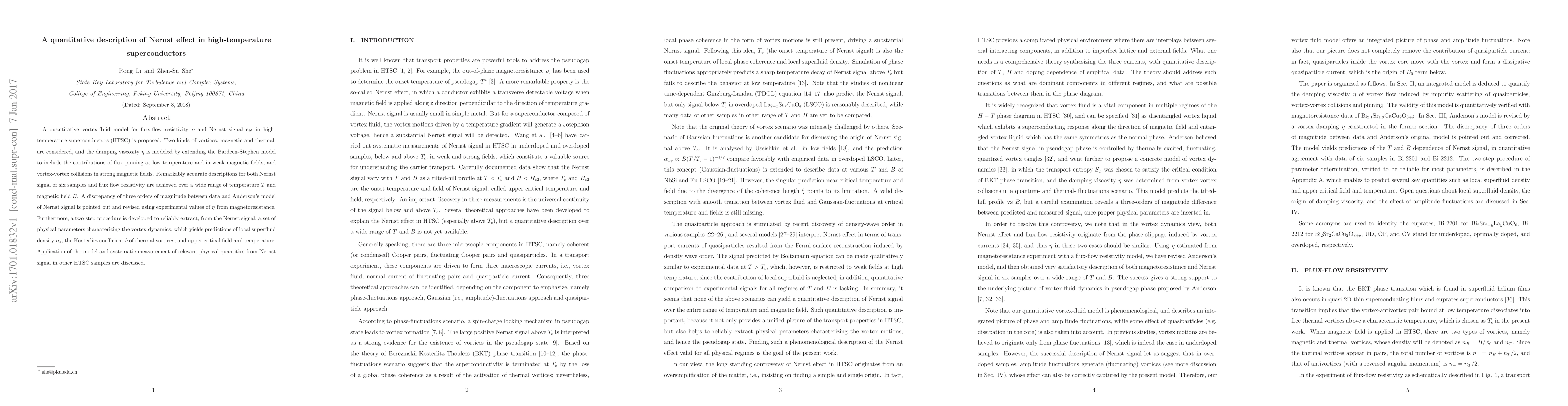This paper proposes a vortex-fluid model to quantitatively describe the Nernst effect and flux-flow resistivity in high-temperature superconductors, achieving accurate predictions over a wide range of conditions. It revises discrepancies in existing Nernst signal models and develops a method to extract key vortex dynamics parameters from the Nernst signal.