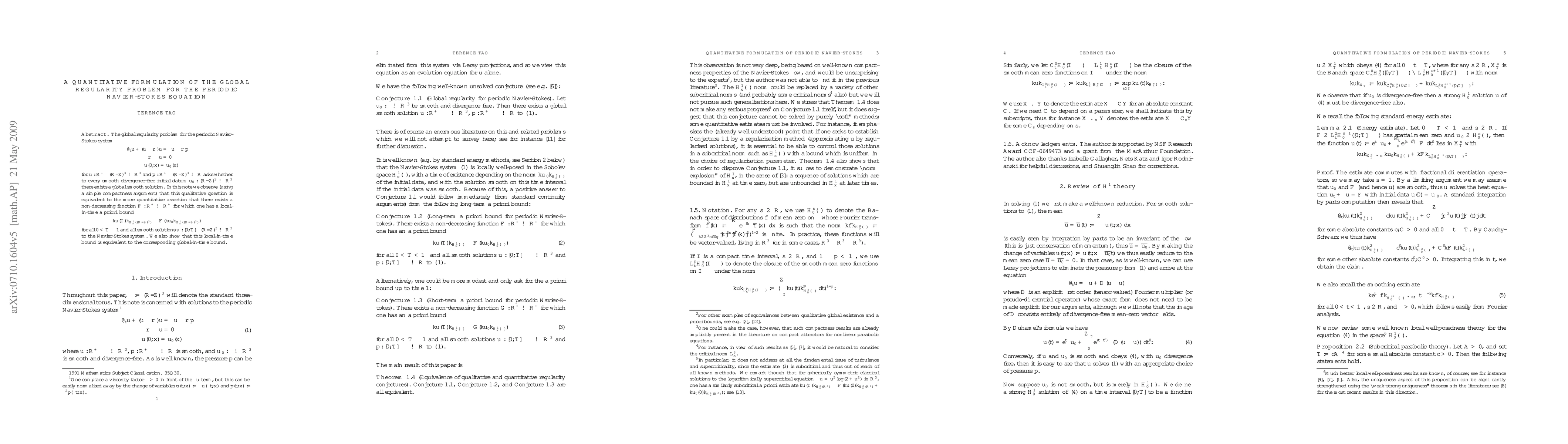 This paper reformulates the global regularity problem for the periodic Navier-Stokes equation in a quantitative manner, showing that the existence of a global smooth solution is equivalent to the existence of a non-decreasing function ensuring a local-in-time bound on the solution's $H^1$ norm. It also proves that the local-in-time bound implies the global-in-time bound.