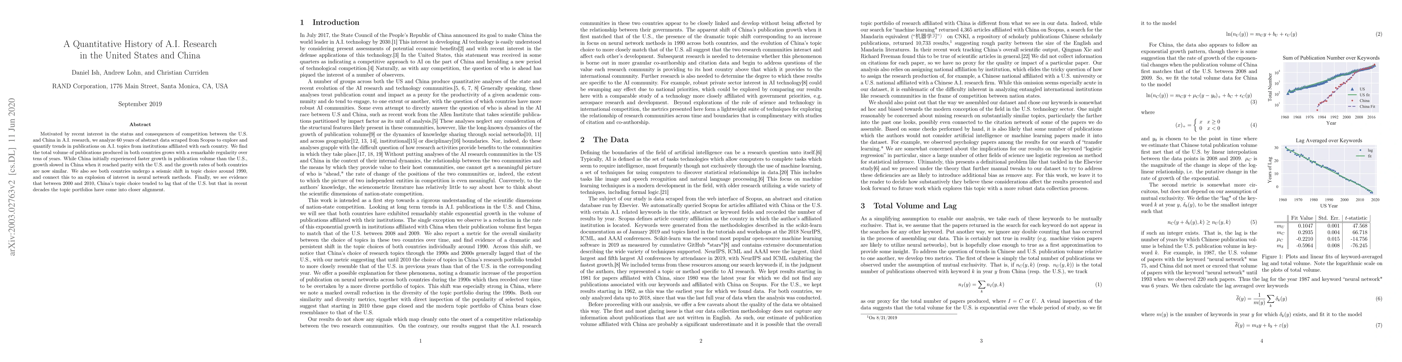 Motivated by recent interest in the status and consequences of competition between the U.S. and China in A.I. research, we analyze 60 years of abstract data scraped from Scopus to explore and quantify trends in publications on A.I. topics from institutions affiliated with each country. We find the total volume of publications produced in both countries grows with a remarkable regularity over tens of years. While China initially experienced faster growth in publication volume than the U.S., growth slowed in China when it reached parity with the U.S. and the growth rates of both countries are now similar. We also see both countries undergo a seismic shift in topic choice around 1990, and connect this to an explosion of interest in neural network methods. Finally, we see evidence that between 2000 and 2010, China's topic choice tended to lag that of the U.S. but that in recent decades the topic portfolios have come into closer alignment.