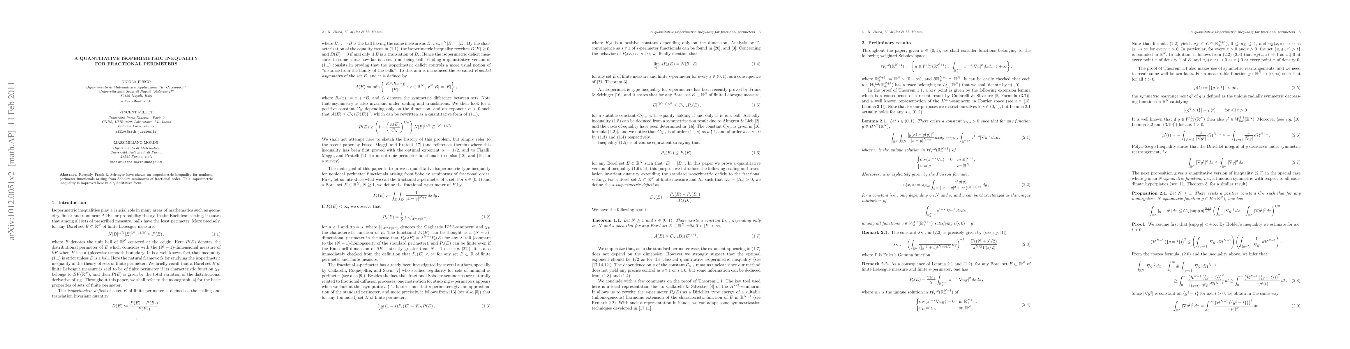 Summary: This paper refines the isoperimetric inequality for nonlocal perimeter functionals derived from fractional Sobolev seminorms, providing a more precise quantitative version of the inequality established by Frank and Seiringer.