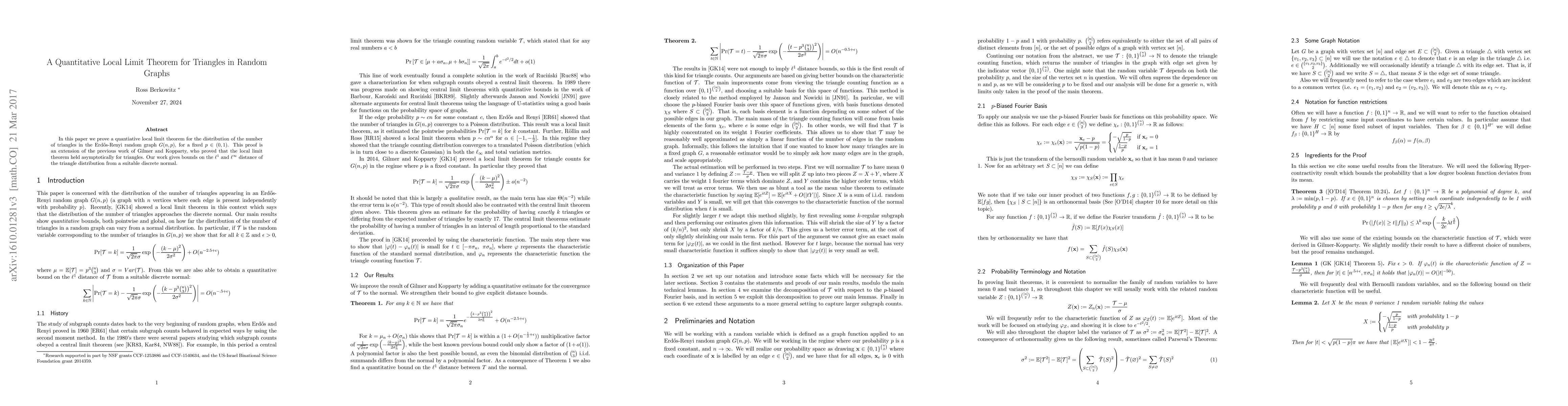 In this paper we prove a quantiative local limit theorem for the distribution of the number of triangles in the Erd\H{o}s-Renyi random graph $G(n,p)$, for a fixed $p\in (0,1)$. This proof is an extension of the previous work of Gilmer and Kopparty, who proved that the local limit theorem held asymptotically for triangles. Our work gives bounds on the $\ell^1$ and $\ell^\infty$ distance of the triangle distribution from a suitable discrete normal.
