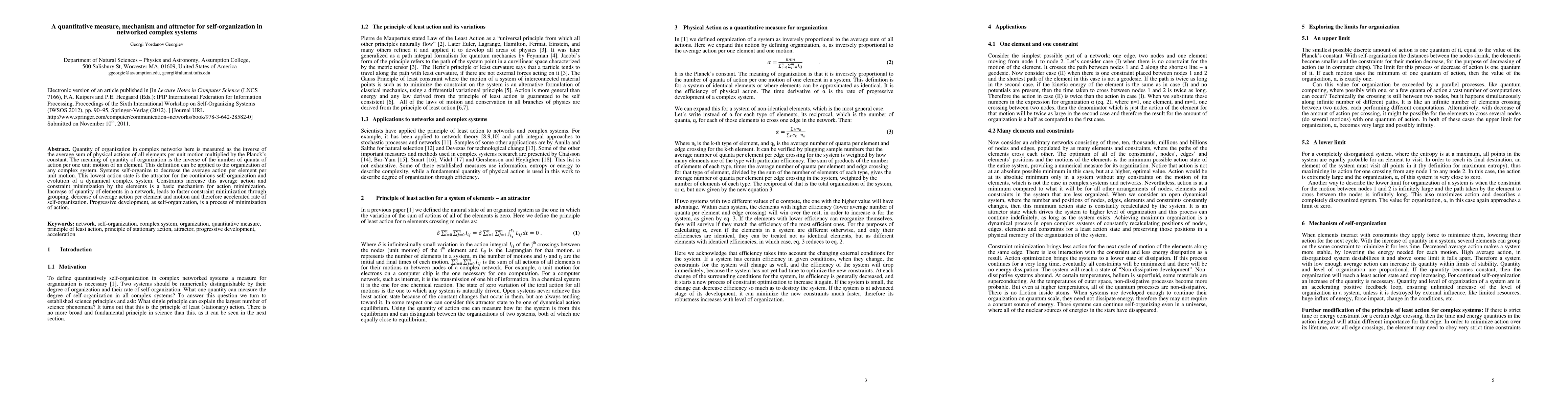 This paper proposes a quantitative measure for the organization in complex networks, defined as the inverse of the average action per element per unit motion, and uses Planck's constant for this measure. It identifies self-organization as a process where systems minimize average action, with the lowest action state acting as an attractor for continuous evolution.