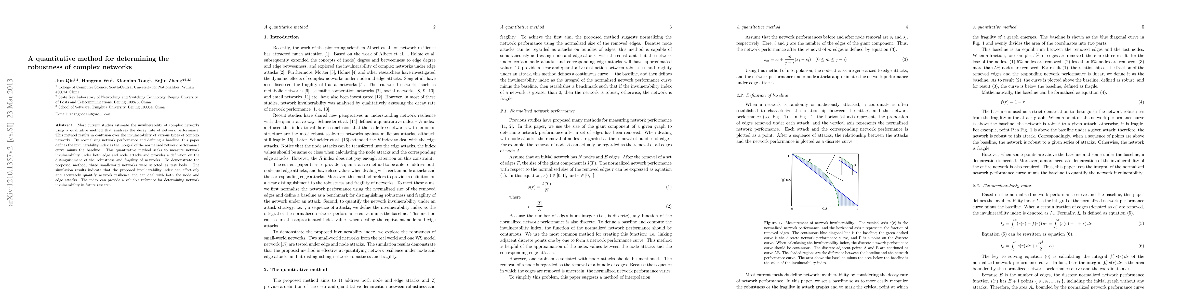 Most current studies estimate the invulnerability of complex networks using a qualitative method that analyzes the inaccurate decay rate of network efficiency. This method results in confusion over the invulnerability of various types of complex networks. By normalizing network efficiency and defining a baseline, this paper defines the invulnerability index as the integral of the difference between the normalized network efficiency curve and the baseline. This quantitative method seeks to establish a benchmark for the robustness and fragility of networks and to measure network invulnerability under both edge and node attacks. To validate the reliability of the proposed method, three small-world networks were selected as test beds. The simulation results indicate that the proposed invulnerability index can effectively and accurately quantify network resilience. The index should provide a valuable reference for determining network invulnerability in future research.