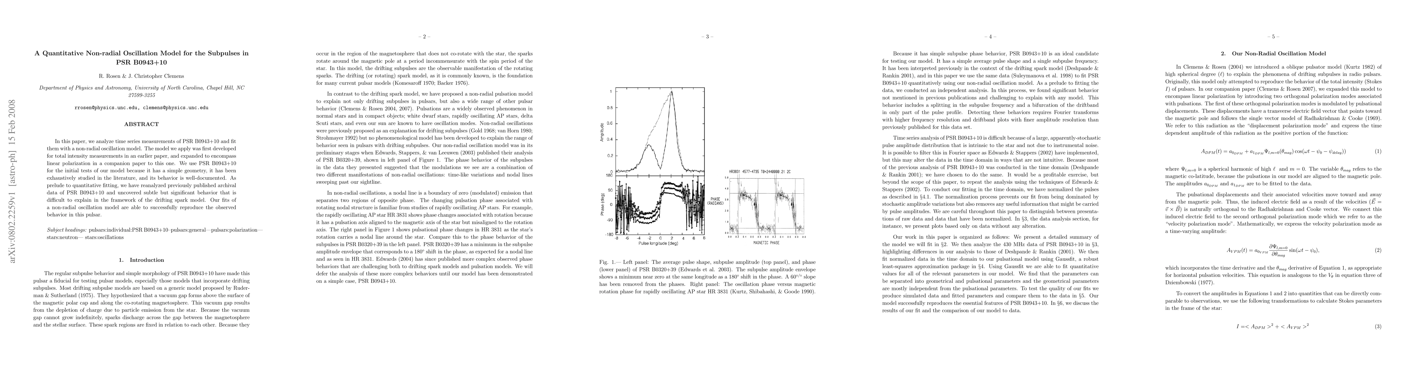 This paper develops a quantitative non-radial oscillation model to analyze subpulses in PSR B0943+10, successfully fitting time series measurements and revealing behavior not explained by the drifting spark model. The model's initial tests on PSR B0943+10, due to its well-documented and simple geometry, show significant, subtle behaviors.