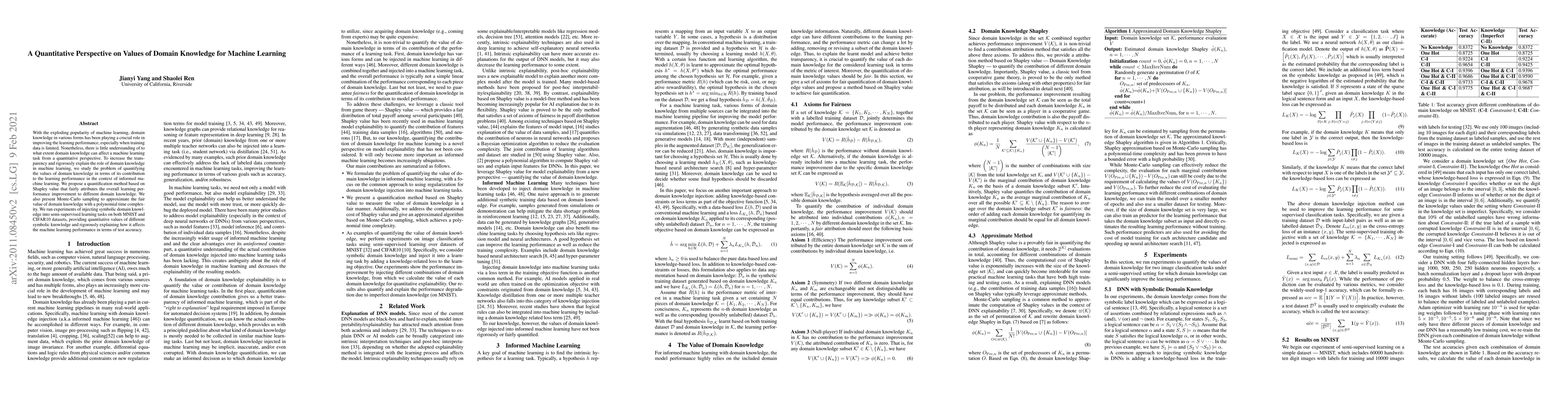 This paper proposes a method to quantify the value of domain knowledge in machine learning, using Shapley values to attribute performance improvements to different knowledge sources. Experiments on MNIST and CIFAR10 datasets demonstrate how symbolic domain knowledge enhances semi-supervised learning, providing quantitative insights into its impact on test accuracy.