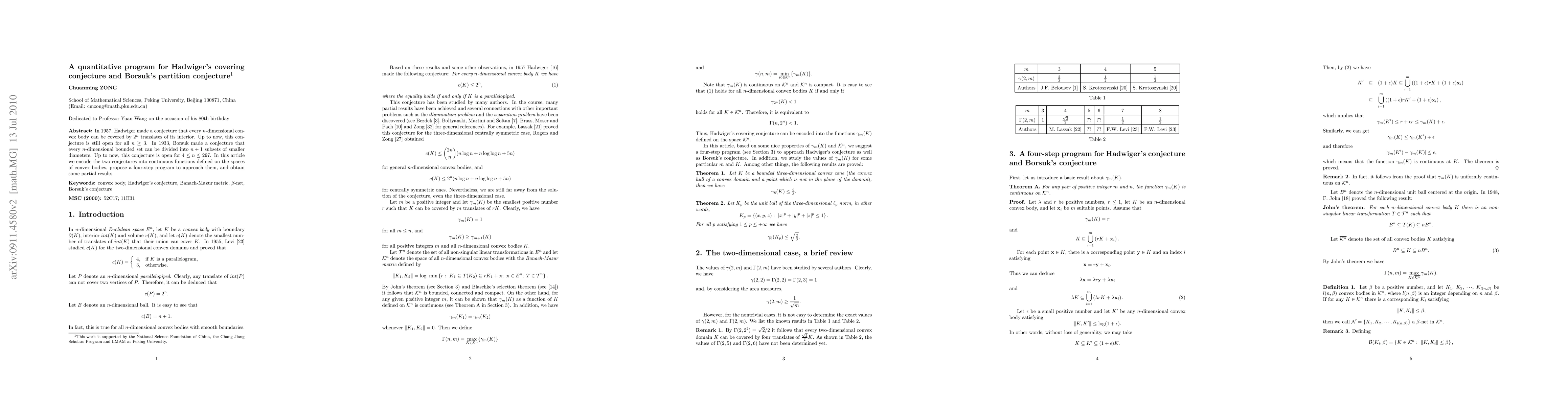 This paper proposes a quantitative program to tackle Hadwiger's covering conjecture and Borsuk's partition conjecture by encoding them into continuous functions on convex bodies, and presents a four-step approach along with some initial partial results.