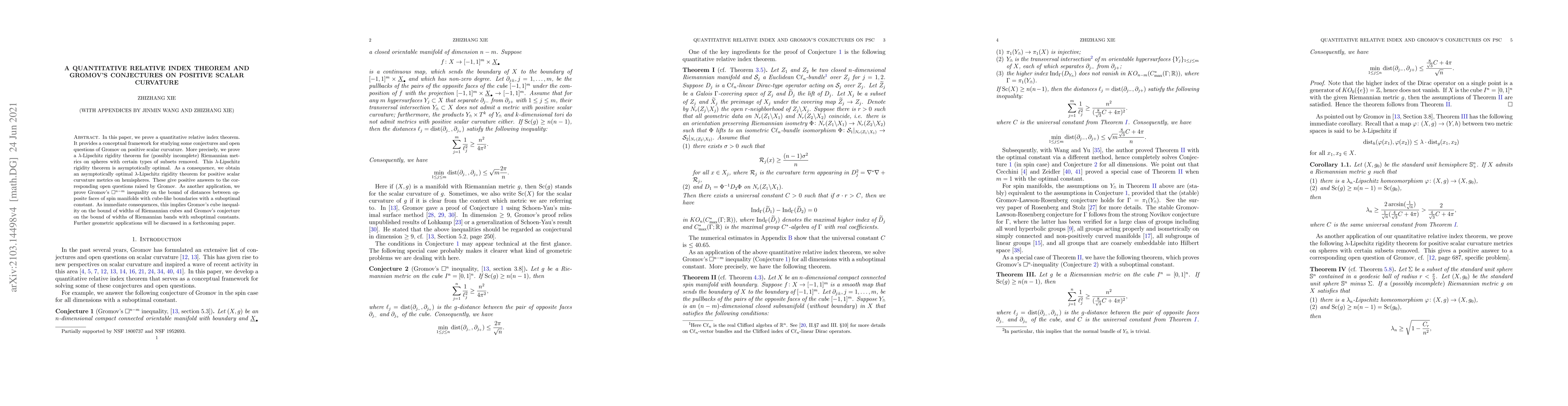 In this paper, we prove a quantitative relative index theorem. It provides a conceptual framework for studying some conjectures and open questions of Gromov on positive scalar curvature. More precisely, we prove a $\lambda$-Lipschitz rigidity theorem for (possibly incomplete) Riemannian metrics on spheres with certain types of subsets removed. This $\lambda$-Lipschitz rigidity theorem is asymptotically optimal. As a consequence, we obtain an asymptotically optimal $\lambda$-Lipschitz rigidity theorem for positive scalar curvature metrics on hemispheres. These give positive answers to the corresponding open questions raised by Gromov. As another application, we prove Gromov's $\square^{n-m}$ inequality on the bound of distances between opposite faces of spin manifolds with cube-like boundaries with a suboptimal constant. As immediate consequences, this implies Gromov's cube inequality on the bound of widths of Riemannian cubes and Gromov's conjecture on the bound of widths of Riemannian bands with suboptimal constants. Further geometric applications will be discussed in a forthcoming paper.