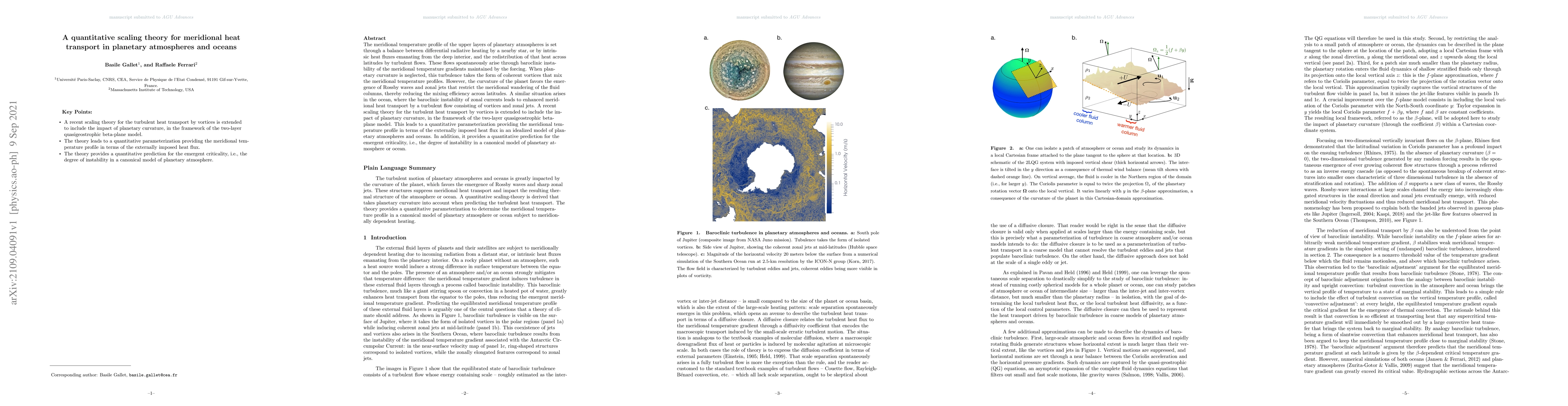 This paper develops a quantitative scaling theory for meridional heat transport in planetary atmospheres and oceans, incorporating the effects of planetary curvature. It extends a previous theory for turbulent heat transport by vortices to include Rossby waves and zonal jets, providing a parameterization for meridional temperature profiles and predicting the degree of instability in planetary systems.