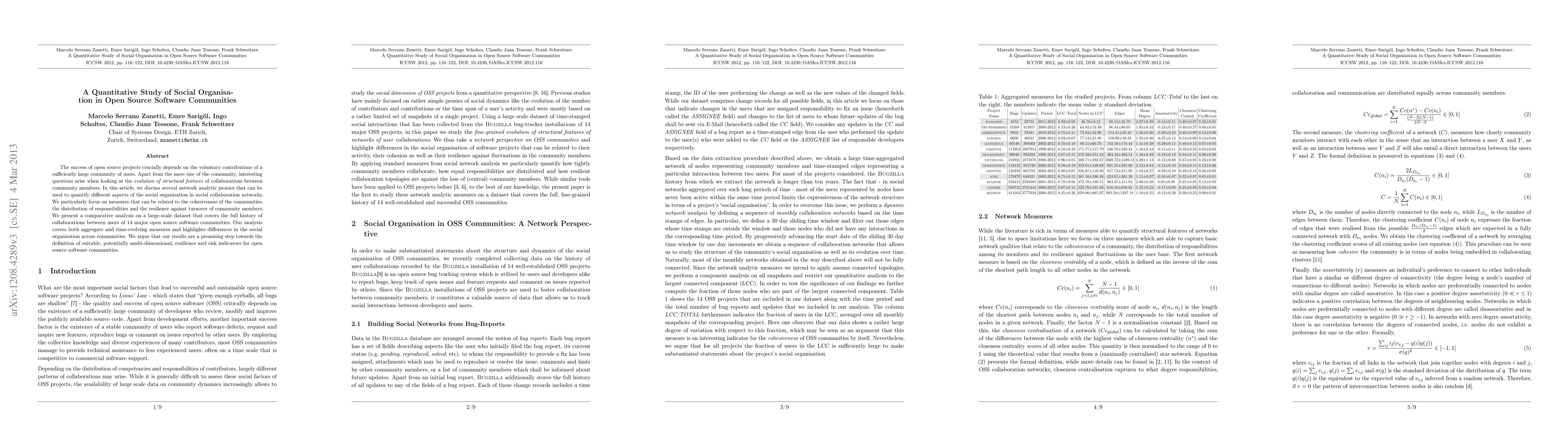 The success of open source projects crucially depends on the voluntary contributions of a sufficiently large community of users. Apart from the mere size of the community, interesting questions arise when looking at the evolution of structural features of collaborations between community members. In this article, we discuss several network analytic proxies that can be used to quantify different aspects of the social organisation in social collaboration networks. We particularly focus on measures that can be related to the cohesiveness of the communities, the distribution of responsibilities and the resilience against turnover of community members. We present a comparative analysis on a large-scale dataset that covers the full history of collaborations between users of 14 major open source software communities. Our analysis covers both aggregate and time-evolving measures and highlights differences in the social organisation across communities. We argue that our results are a promising step towards the definition of suitable, potentially multi-dimensional, resilience and risk indicators for open source software communities.