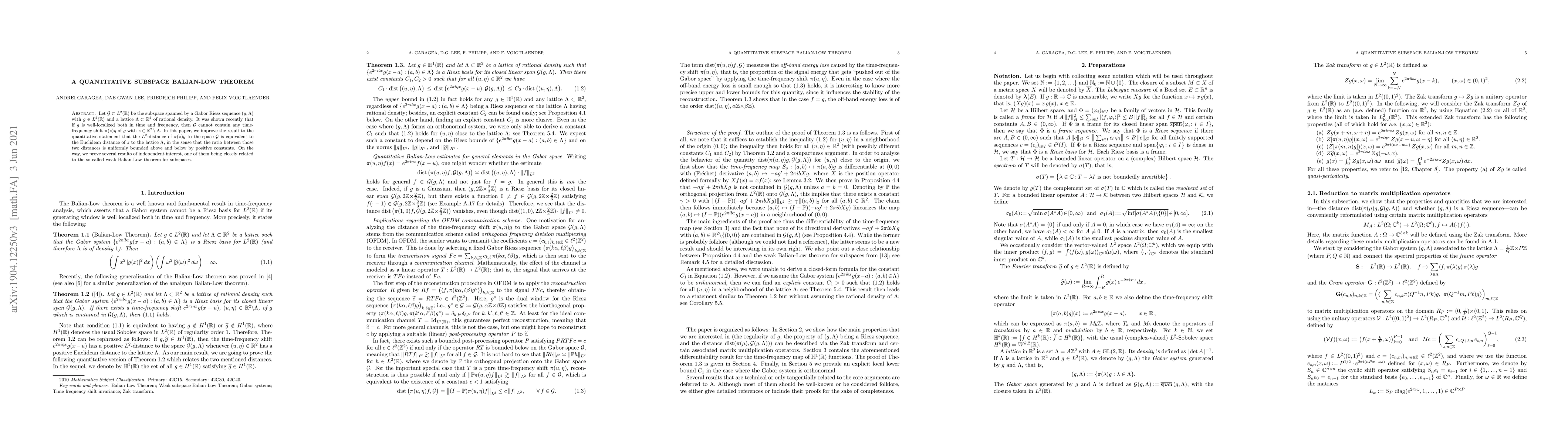 This paper establishes a quantitative subspace Balian-Low theorem for Gabor Riesz sequences, proving that the $L^2$-distance of any time-frequency shift of $g$ from the subspace $\mathcal G$ is proportional to the Euclidean distance of the shift from the lattice $\Lambda$. It also provides several results of independent interest, including a relation to the weak Balian-Low theorem for subspaces.