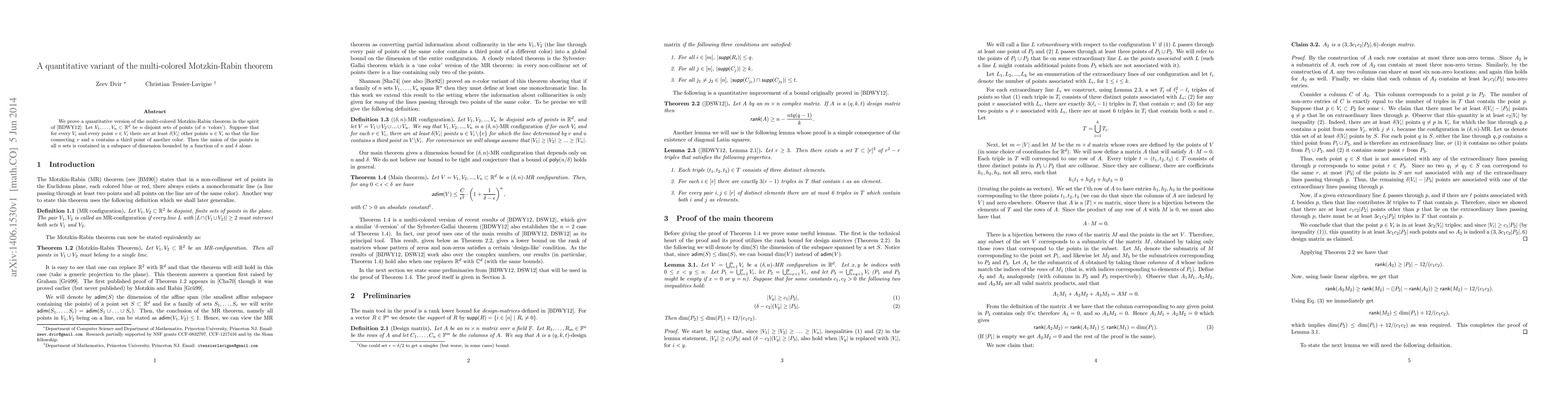 We prove a quantitative version of the multi-colored Motzkin-Rabin theorem in the spirit of [BDWY12]: Let $V_1,\ldots,V_n \subset R^d$ be $n$ disjoint sets of points (of $n$ `colors'). Suppose that for every $V_i$ and every point $v \in V_i$ there are at least $\delta |V_i|$ other points $u \in V_i$ so that the line connecting $v$ and $u$ contains a third point of another color. Then the union of the points in all $n$ sets is contained in a subspace of dimension bounded by a function of $n$ and $\delta$ alone.