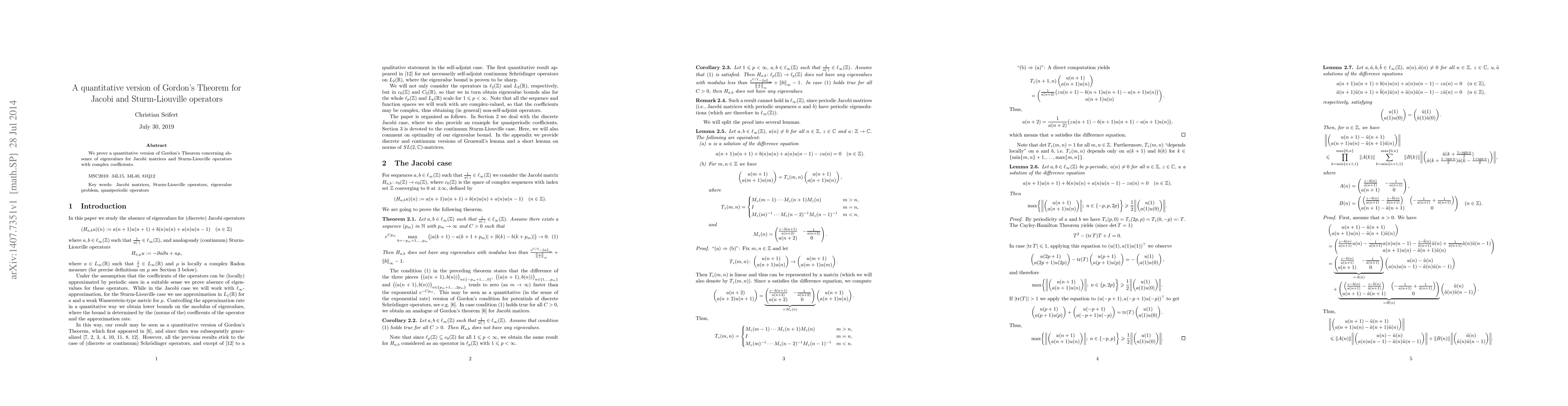 Summary: This paper establishes a quantitative variant of Gordon's Theorem, demonstrating the absence of eigenvalues for Jacobi matrices and Sturm-Liouville operators featuring complex coefficients. The results provide precise measures of the eigenvalue gaps.